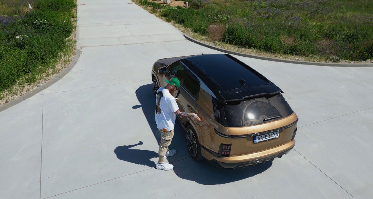 kódu, vizuálne aj významovo. Jeho zlatá stránka je zjavná na prvý pohľad. Ide o ambíciu preraziť do prémiového sveta SUV-kupé, ktorá by si trúfla postaviť sa aj vedľa Range Roveru Velar. Môžeme to povedať už len na základe rozmerov – 4 740 x 1 910 x 1 680 mm pri rázvore 2 680 mm a svetlej výške 206 mm. Spomínanú ambíciu nájdeme v masívnych, 20-palcových diskoch s diamantovým vzorom, ktoré autu dodávajú postoj ako z prezentačnej haly technologickej korporácie. Je rovnako prítomná v ďalších detailoch – tenké LED svetlomety, až po svetelnú linku na prednej maske, ktorej grafika pripomína kórejskú vlajku.
