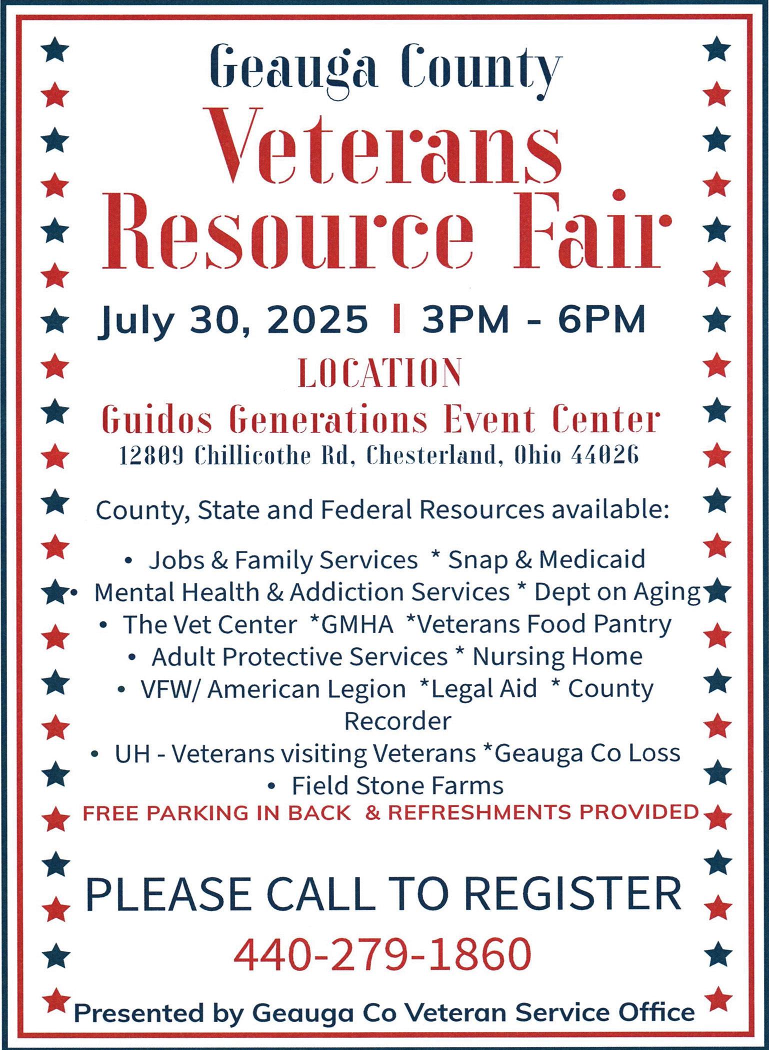Geauga County Veteran Service Office is hosting a Veterans Resource Fair at Guidos Generations Event Center in Chester Township. Learn about county, state and federal resources available for veterans and their families. Refreshments will be provided. For more information and to register, call 440-279-1860.