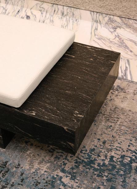 Visitors are greeted by a sophisticated interplay of textures: concrete floors juxtaposed with elegant Cipolino marble, complemented by custom carpets. The walls feature rough cast render, corduroy concrete, marble, black intumescent paint, mirrors, and wood, creating a visually cohesive yet varied aesthetic.