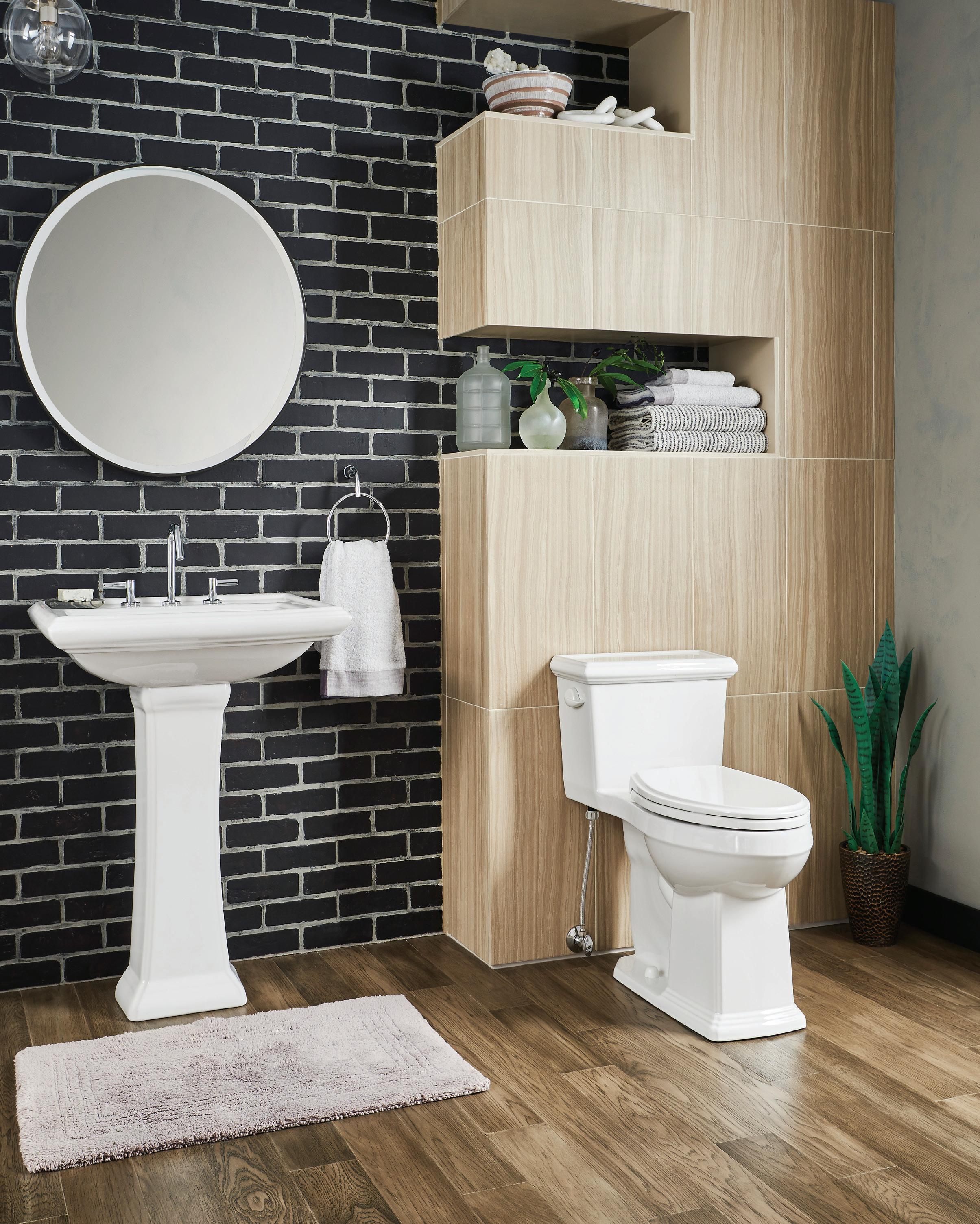 Page de gauche : Toilette monopièce Logan SquareMC à cuvette allongée ErgoHeightMC, plomberie brute de 12 po, 1,28 gpc/Blanc/G0021020