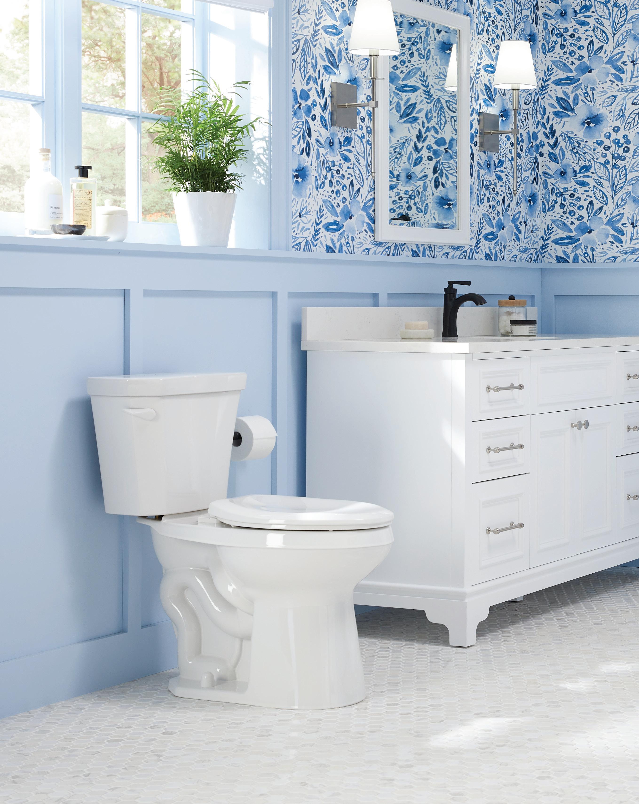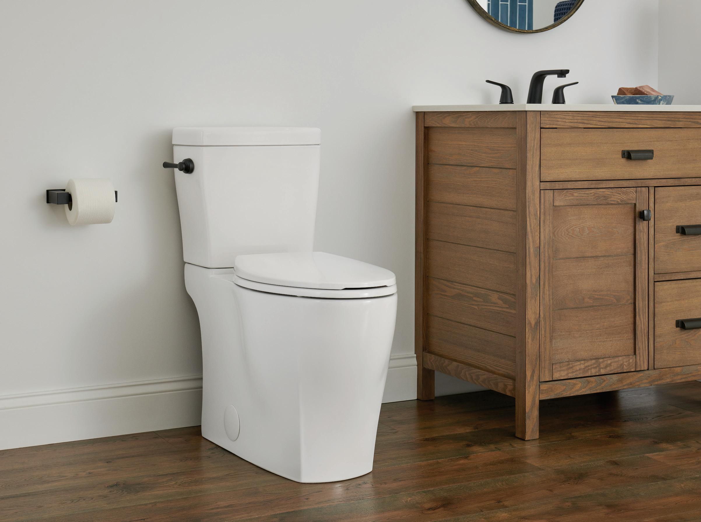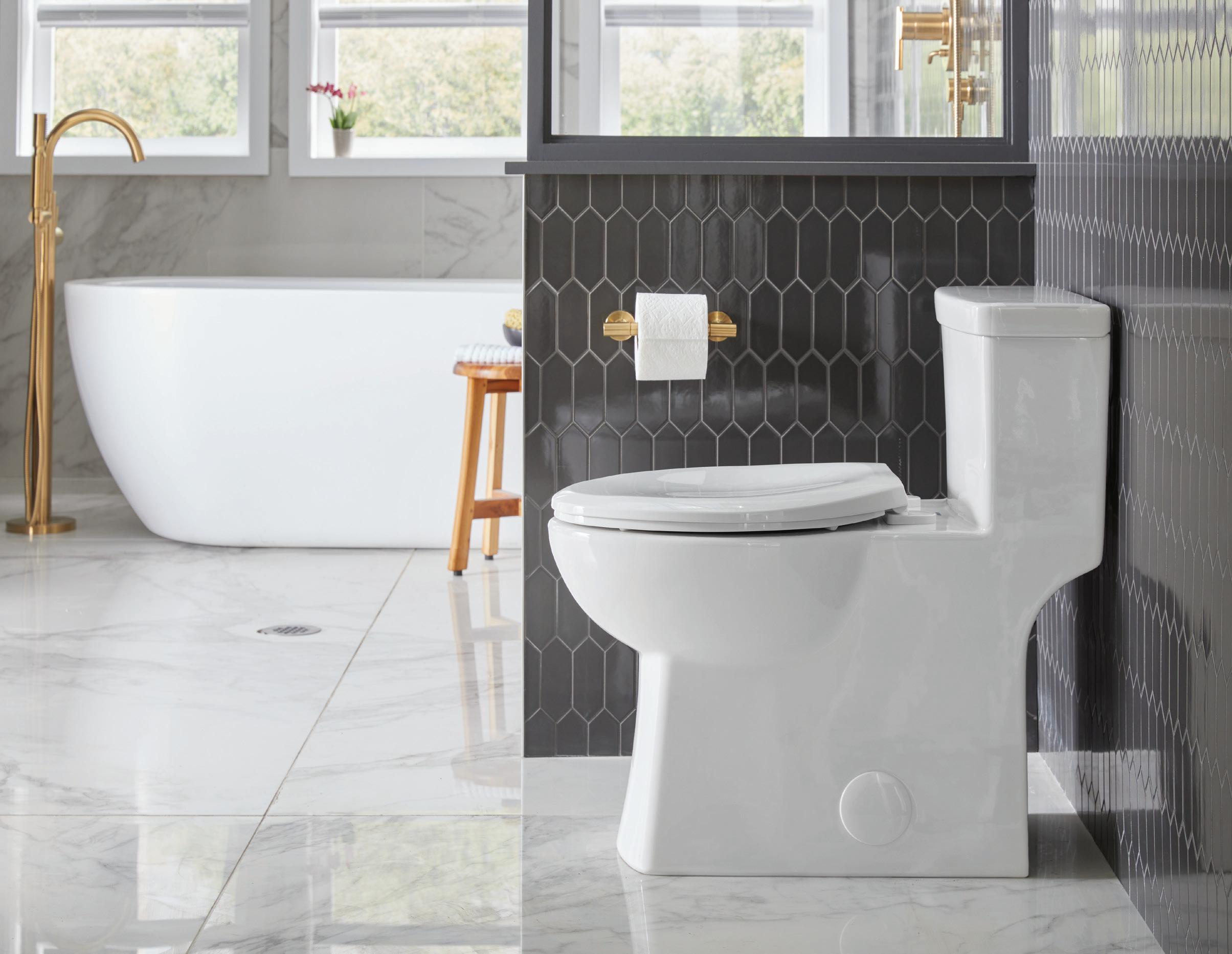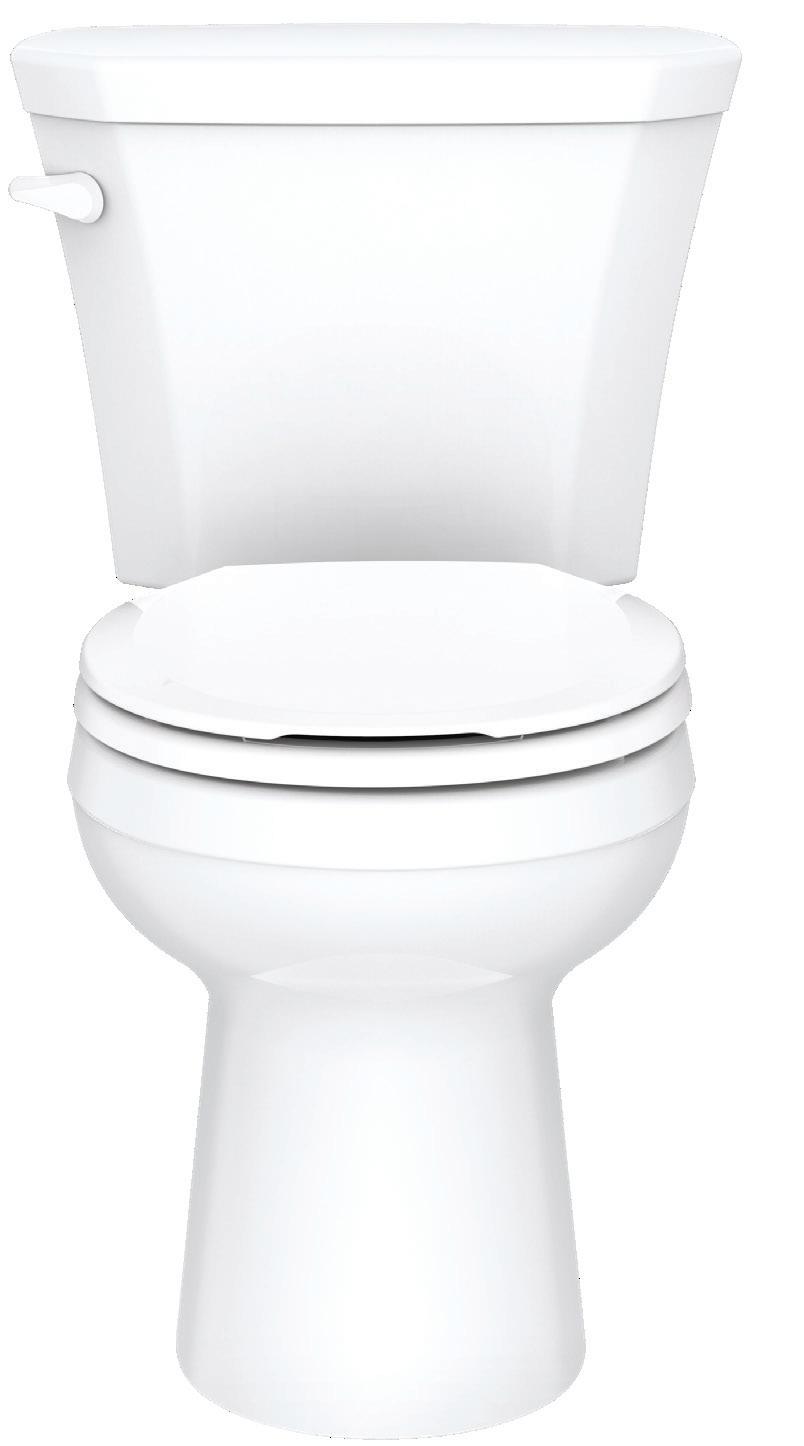 Page de gauche : Toilette deux pièces AvalancheMC à cuvette allongée ErgoHeightMC, plomberie brute de 12 po, 1,28 gpc/Blanc/GWS31818