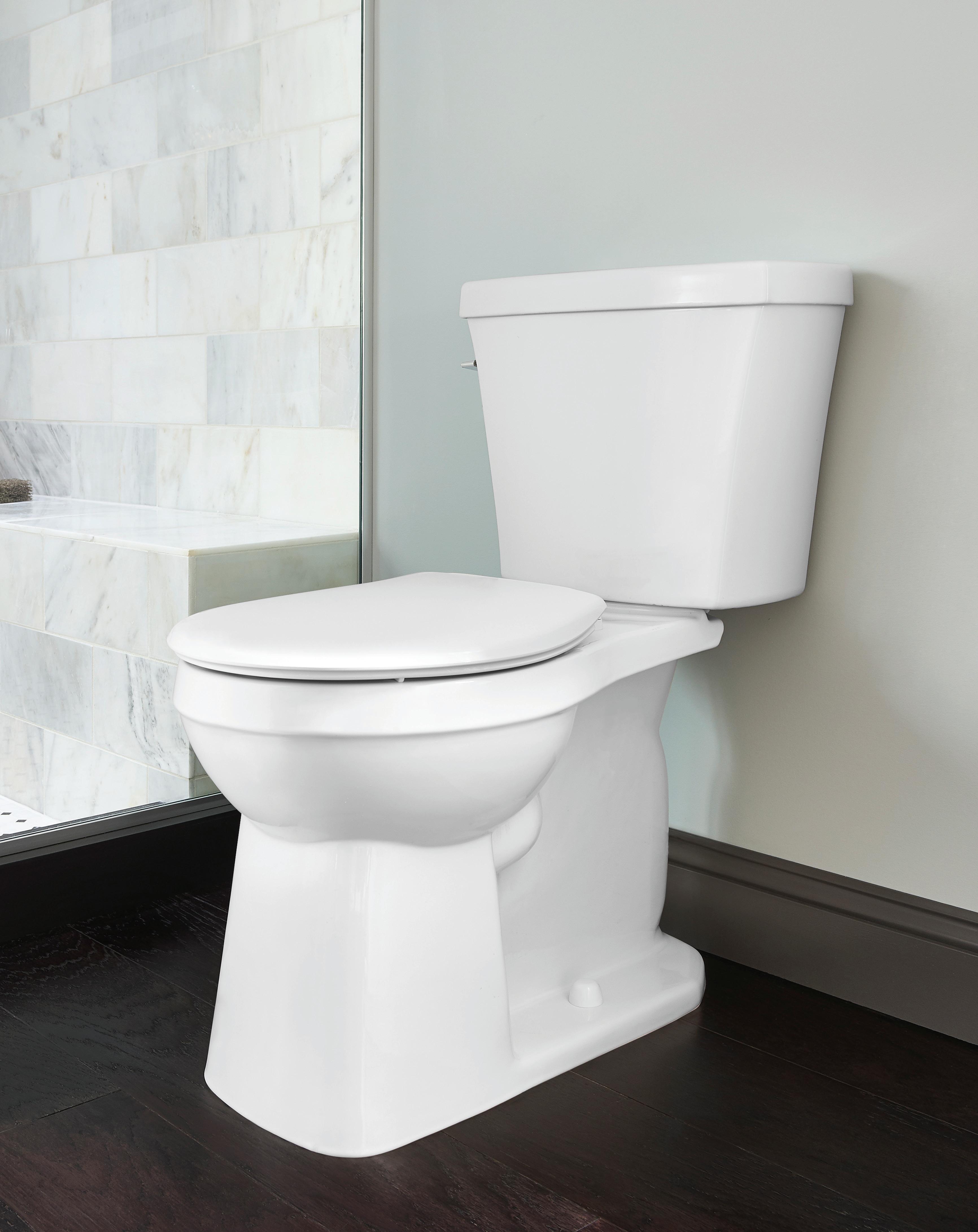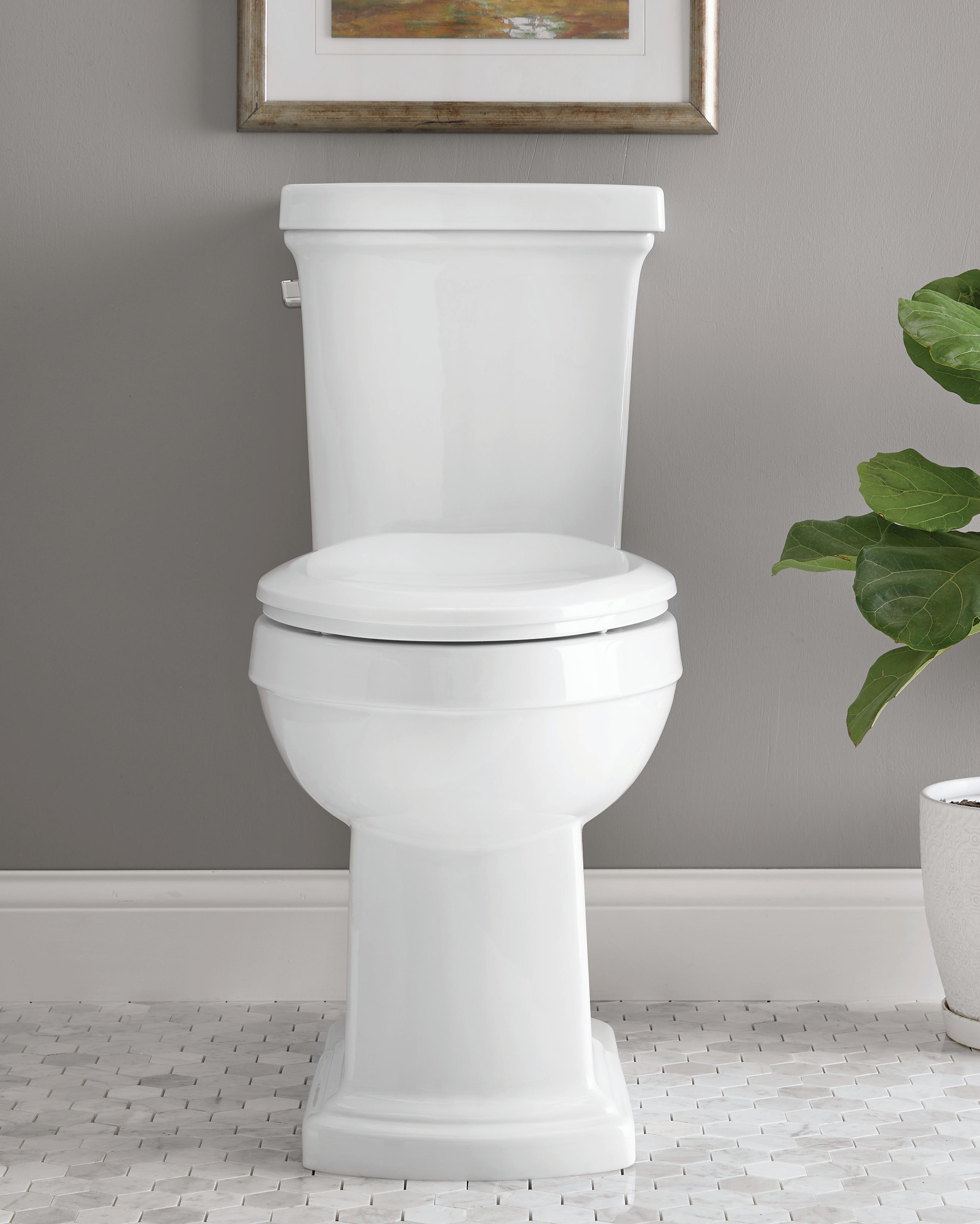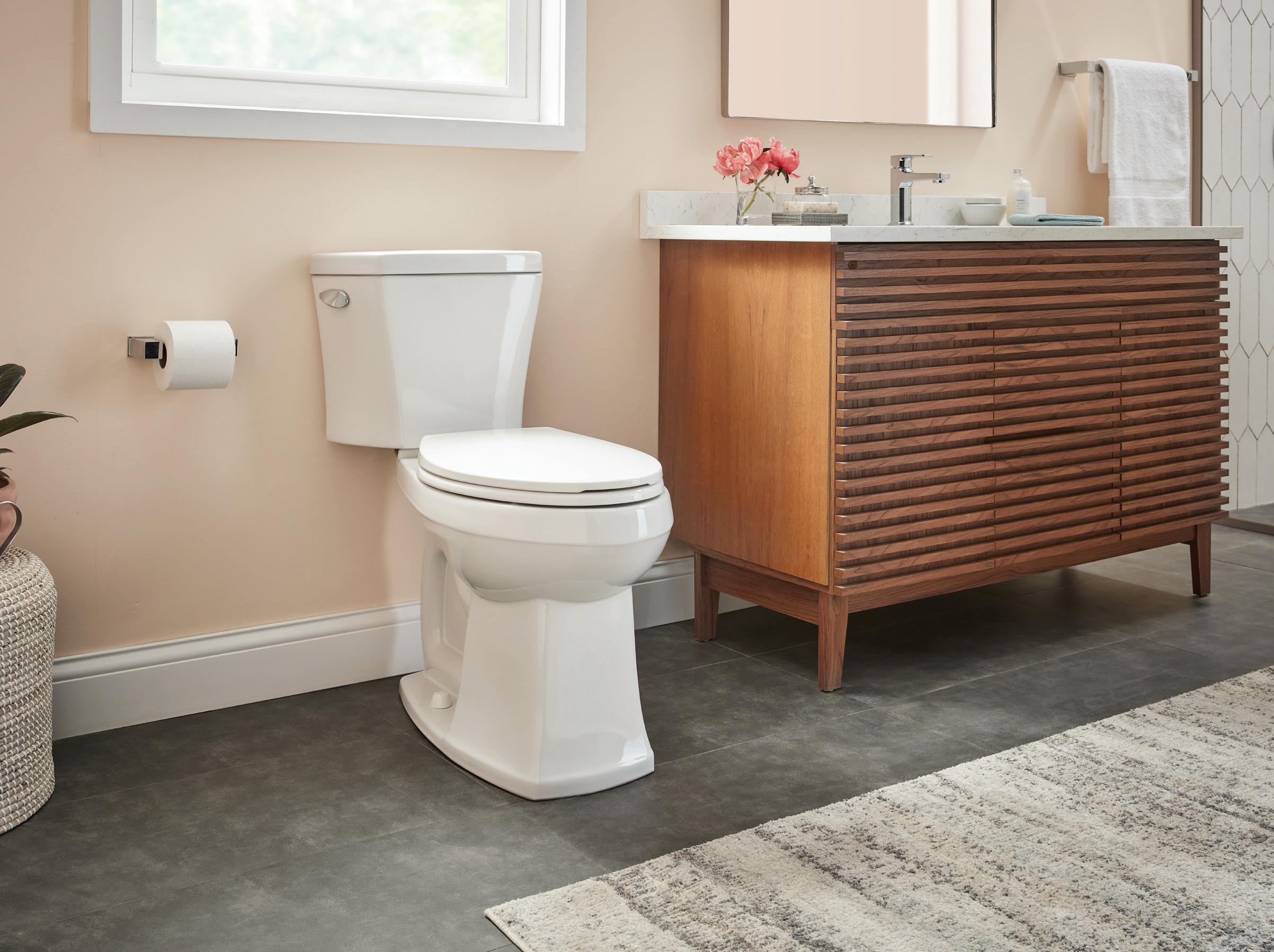 Page de gauche : Toilette deux pièces AvalancheMC à cuvette allongée ErgoHeightMC, plomberie brute de 12 po, 1,28 gpc/Blanc/GWS31818