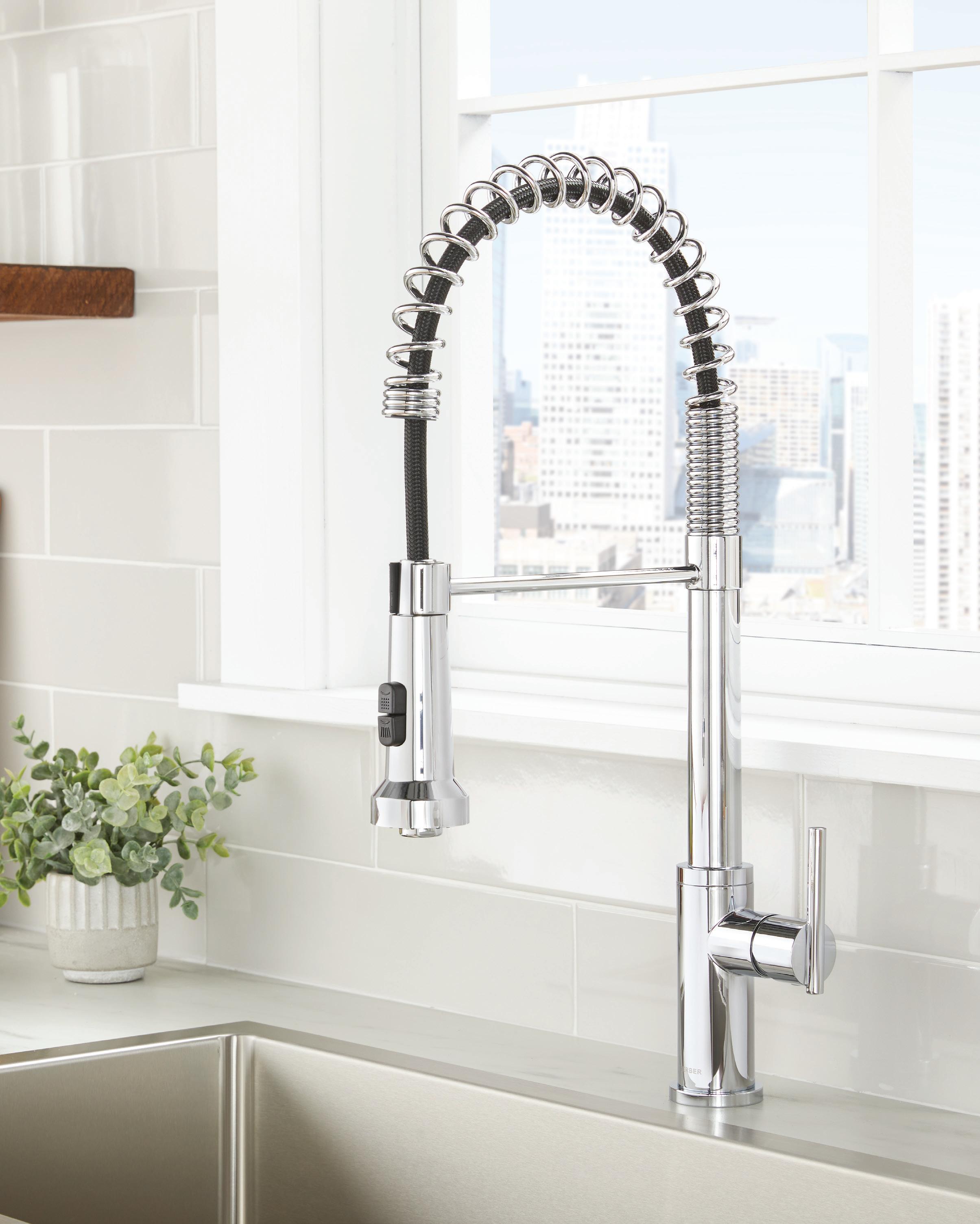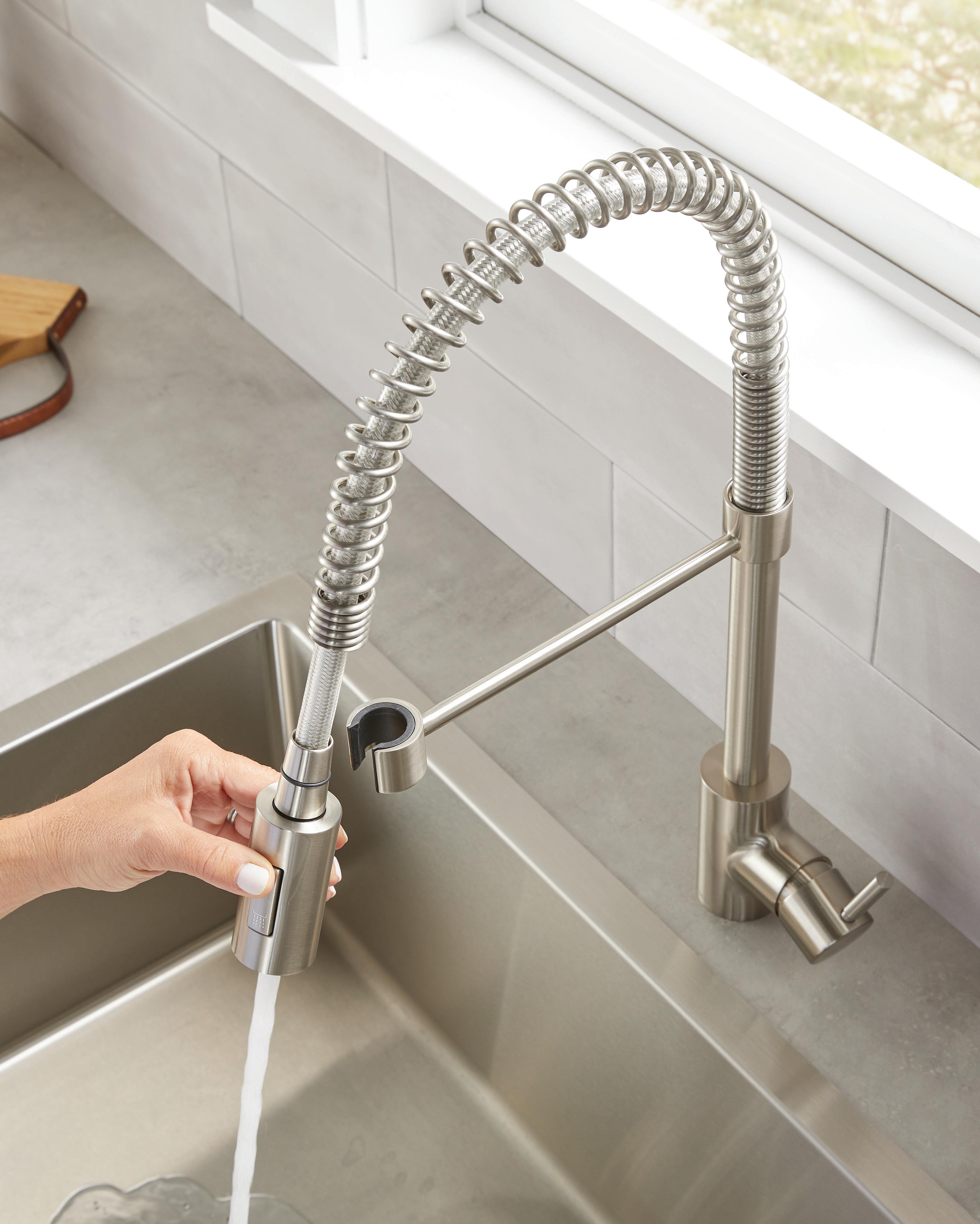 Apportez un peu de style commercial à votre cuisine avec le robinet de prérinçage The FoodieMD. D’un style épuré et minimaliste, ce robinet emprunte des éléments aux robinets de cuisine professionnels, comme la douchette à ressort qui offre une portée supplémentaire pour le rinçage et le nettoyage.