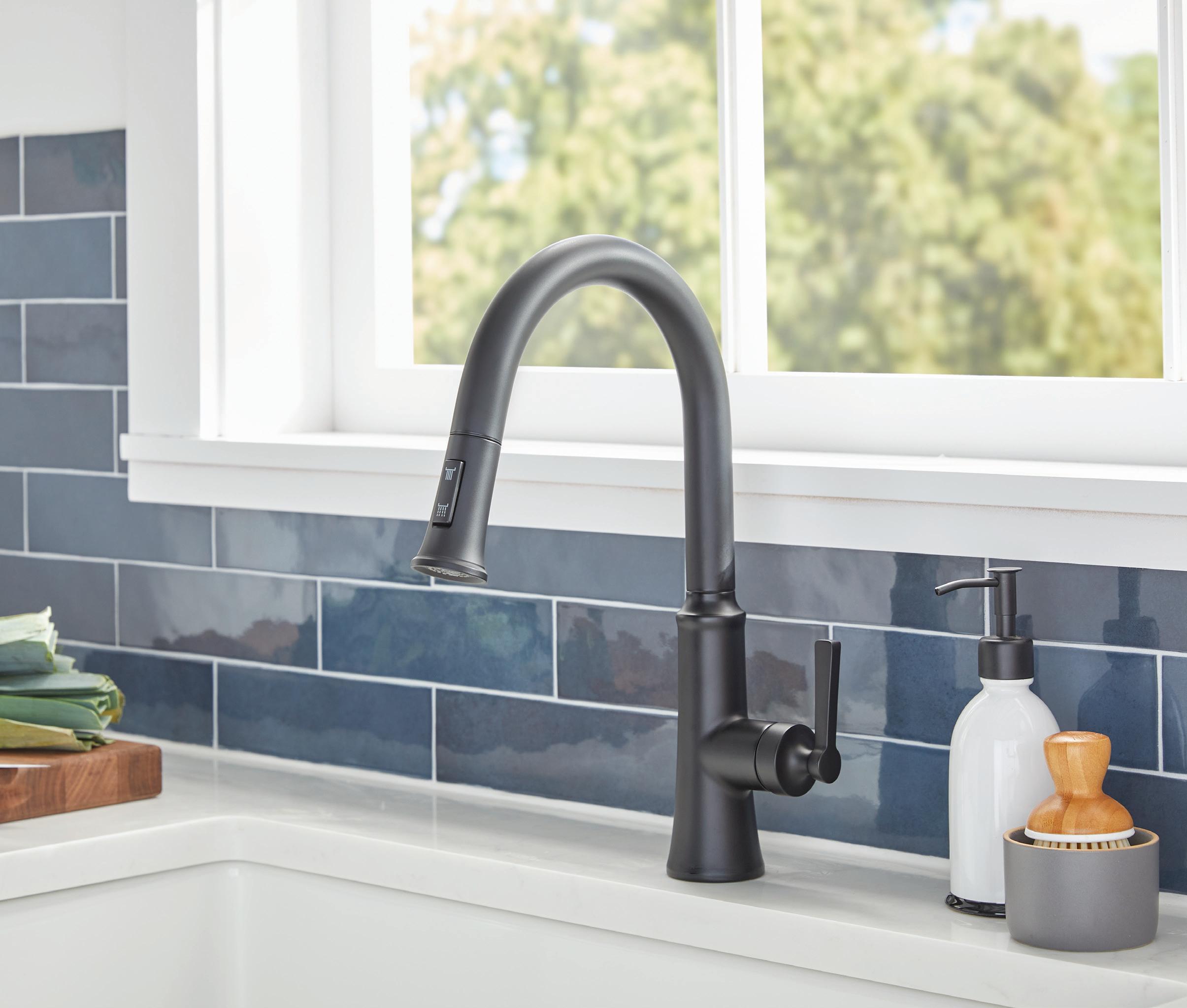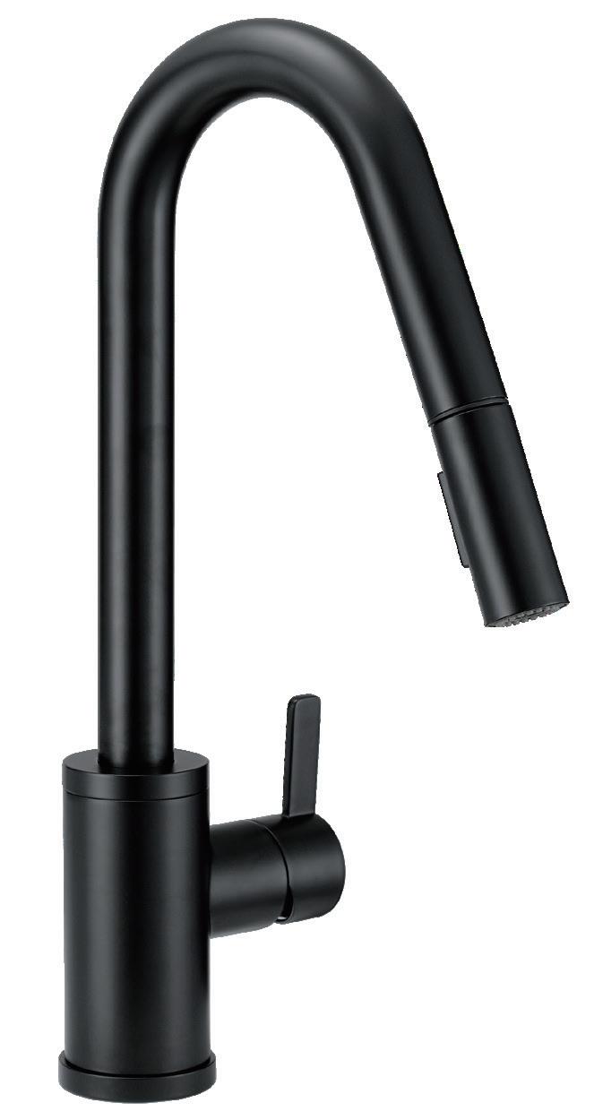 Page de gauche : Robinet de cuisine NortherlyMC à une seule poignée à bec extensible/Noir satiné/D454079BS