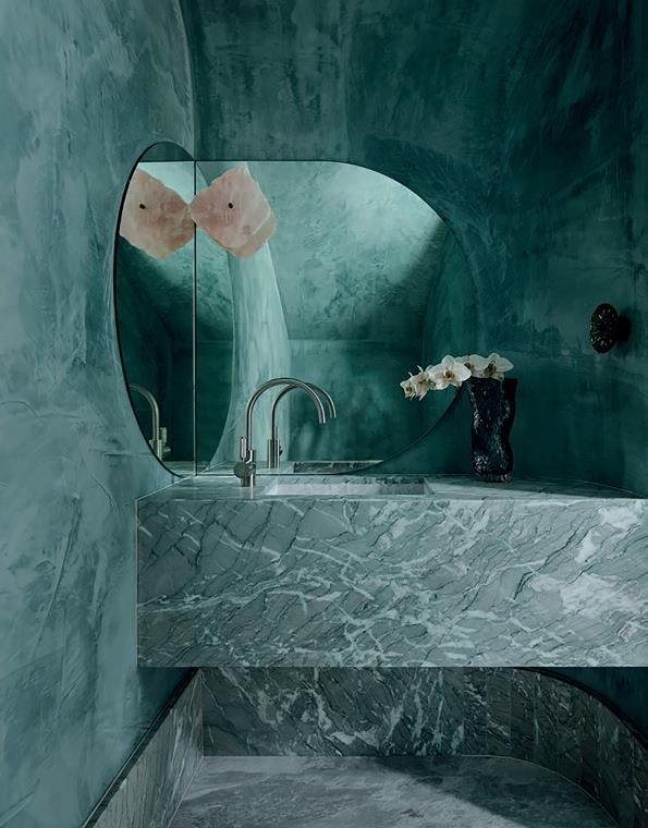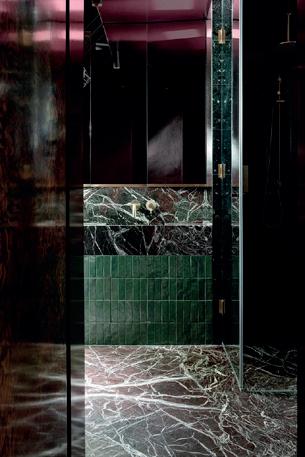 Det private gæstebadeværelse er designet til at være et fristed for afslapning Præcis som på teatret kan du sætte scenen med lys, farver og former. Går du efter at skabe et overdådigt og farverigt badeværelse med dybde, rigdom og detaljer, så kan du med fordel overveje at udstyre det med kraftigt årede marmorflader, dybt tonede fliser og stemningsbelysning. I det viste tilfælde, skabes effekten overbevisende af kilen af lys under stenvasken, som fremhæver de flaskegrønne fliser, og af spejlene, der maksimerer proportionerne af det lille rum. Er der plads til at tilføre et bad, så overvej et statement-badekar i en flot farve. Det tiltrækker øjet og fremhæver rummets intention som et center for afslapning og selvforkælelse.