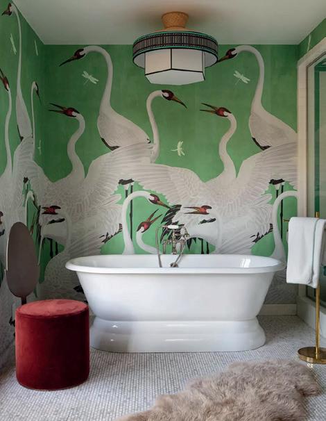 Badeværelsets rolle som et forbigående og (forholdsvist) kortvarigt opholdsrum betyder, at det er en fremragende mulighed til at skabe lidt sjov og tilføre noget personlighed i stylingen af rummet. Uanset badeværelsets størrelse kan du skabe en fantastisk, opløftende stemning med et ægte designstatement i form af et badeværelsestapet. Tag for eksempel dette Hollywood-hjem skabt af LALA Reimagined, hvor man har brugt Guccis svanemotiv til at skabe kontrast i rummet. De små mosaikfliser samt inventar og beslag spiller op til det store vægmaleri og skaber et perfekt, visuelt udtryk. En lækker detalje som den fritstående håndklædestang bidrager fx til at skabe følelsen af at befinde sig i et vidunderligt bijouhotel.
