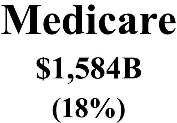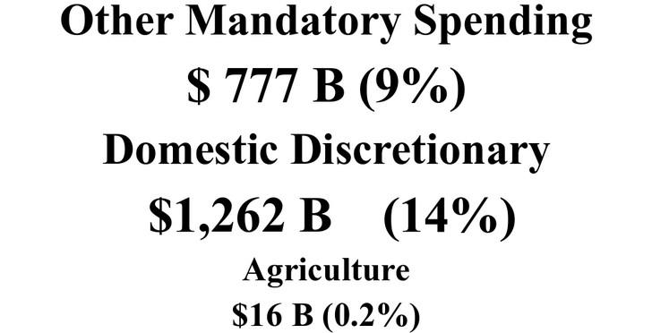 Medicare $1,584B (18%) Defense $998 B (11%) Medicaid $789 B (9%) Social Security $2,175 B (24%) Other Mandatory Spending $ 777 B (9%) Domestic Discretionary $1,262 B (14%) Agriculture $16 B (0.2%) Net Interest $ 1,194 B (13%) Other Health Programs $94 B (2%) $8,915 billion