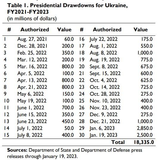 Sources: Dept. of State and Defense press releases through January 19, 2023; Congressional Research Service, January 26, 2023
