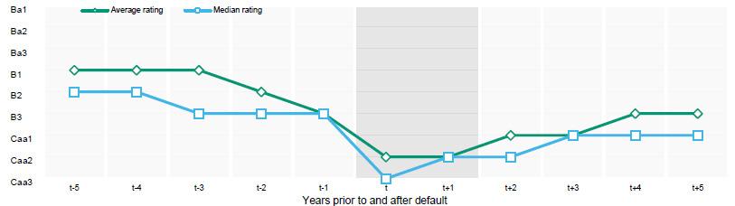 » Historically, credit standing has remained stressed for several years after default: The average rating has taken four years to return to B3 after default.