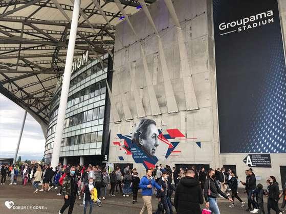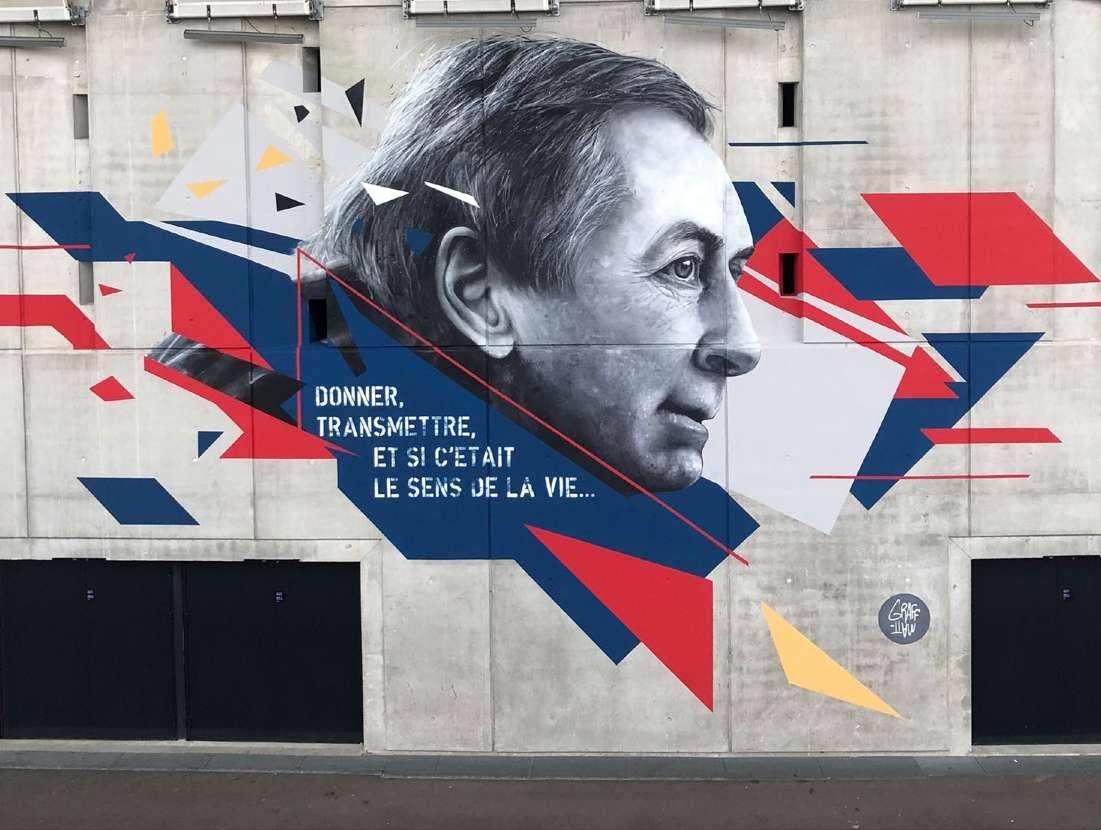 Pour honorer la mémoire de son ancien entraîneur Gérard Houllier décédé en 2020, l’Olympique Lyonnais a commandé cette fresque géante sur la façade extérieure de l’entrée du stade du Groupama Stadium. Une innauguration sera prévue en octobre 2021.