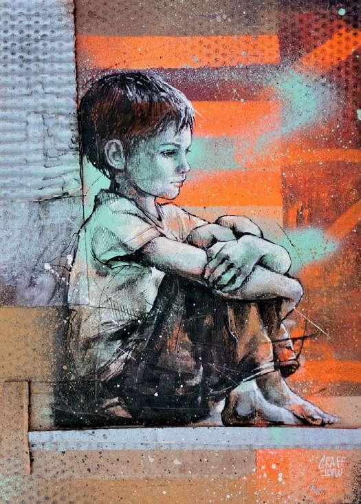 Rythmant son travail entre portraits et scènes urbaines, l’artiste « touche à tout » ne se limite à aucun medium ni aucun support. A l’aise avec les sprays, l’acrylique et les marqueurs, GRAFFMATT se plait aussi à utiliser les matériaux de récupération tels que des palettes en bois ou des meubles usés pour concevoir ses œuvres. En cassant les codes d’un artiste peintre tel qu’on l’imagine, il choisit des brosses usées pour créer des effets « grunge », des grilles d’aération en guise de trames en pochoir et des morceaux de cartons pour donner du relief. Cette technique lui permet de donner du dynamisme et du caractère à son travail. Pour contraster avec cette brutalité, l’artiste intervient à la bombe aérosol et au marqueur pour affiner ses portraits ou ses paysages urbains.