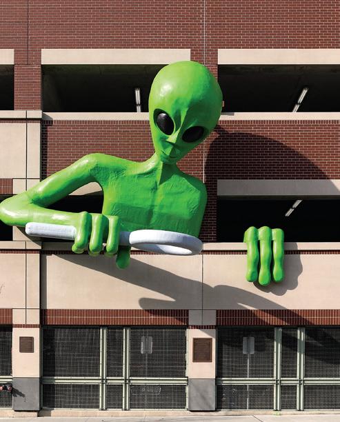 Just across the Ohio River from downtown Cincinnati lies Covington, Kentucky (PICTURED). Its Mainstrasse Village (LEFT TOP) blends artistry with entrepreneurship. “The uninterrupted historic streetscapes of Covington provide the perfect creative backdrop to work, live and play,” shares Emily Palmer Wolff, local artist, preservationist and restaurateur. “Covington is an inclusive city that supports artists and innovators, and as a creative entrepreneur, it’s the perfect place to call home,” she says. As you wander about shops and restaurants, look for ways art enriches the city. From Clive the Alien (LEFT BOTTOM) at Midtown Parking Garage to the recently opened Artmarkit community hub to the continually changing concrete canvas of Scribble Park, art thrives in Covington. Expect that to continue with the new collaboration between ArtsWave and meetNKY, two organizations working together to increase public art and space-making in the city.