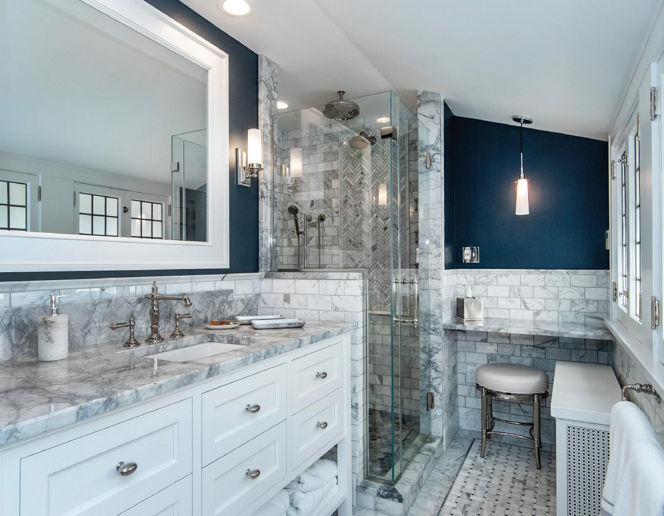 It’s an entrance so dramatic that every detail lingers in the memory. Picture frame molding painted black, like the rest of the walls and woodwork, surrounds large panels of wallpaper resembling the Dutch masters floral still life paintings. Whitewashed oak demilune cabinets stand in stark contrast to the darkness. The stairs are carpeted in a plush cobalt runner that complements the indigo paint on the ceiling and grass cloth in the upstairs hall. Light filters through the elongated black linen drum shades of an angular custom chandelier.