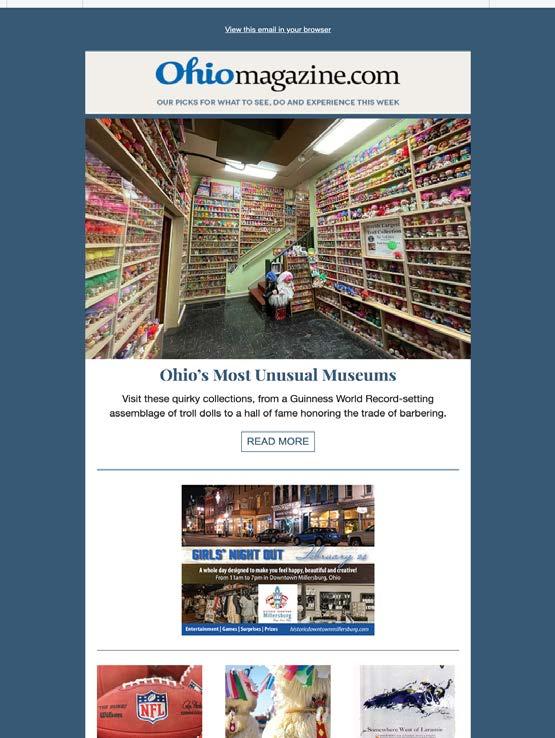 Stay connected with our email newsletters. Learn about fun events and festivals, explore our state’s food scene, get inspiration for outdoor adventures and find your next weekend getaway. Sign up by scanning the QR code or by visiting ohiomagazine.com/newsletters