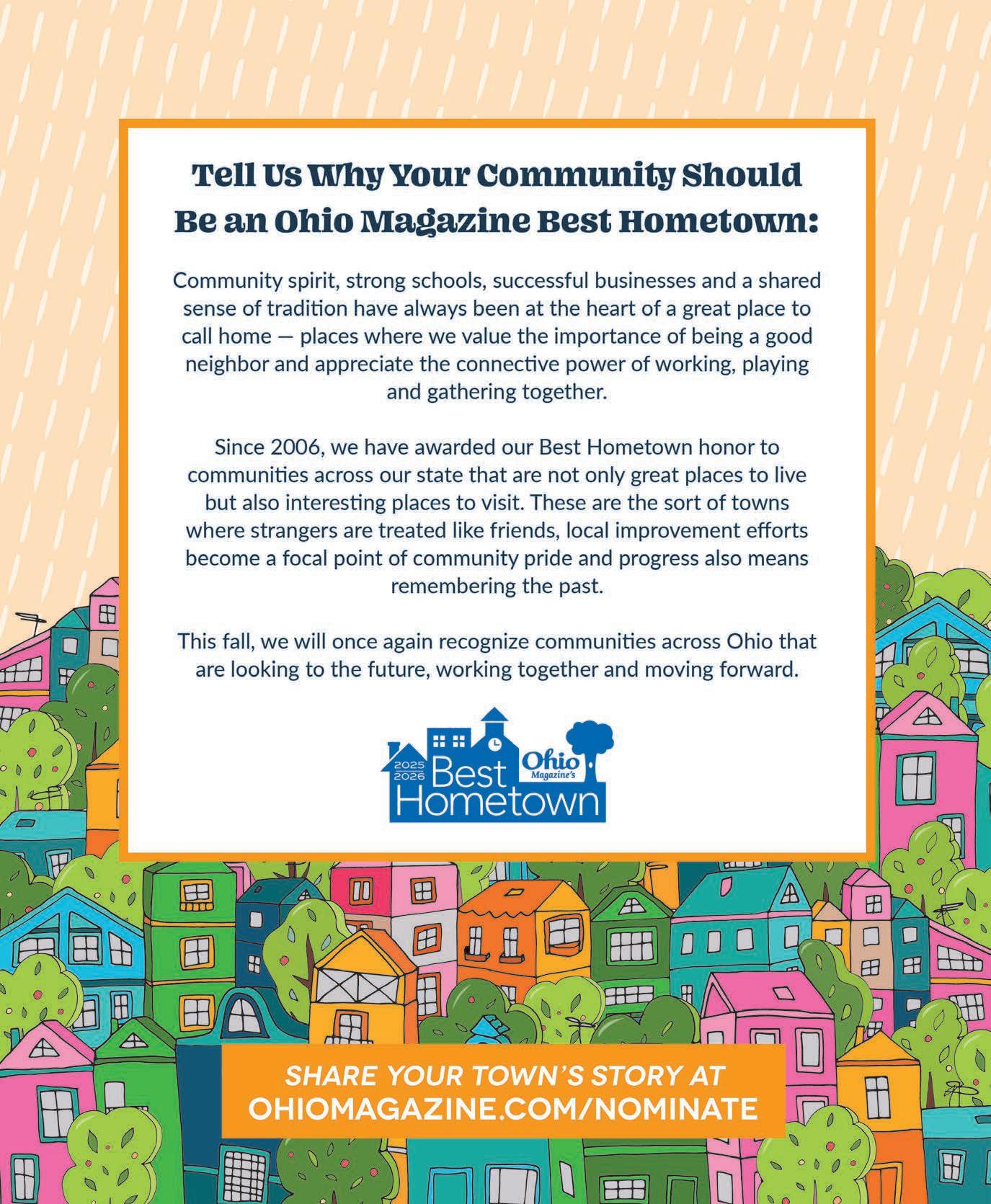 Nominations for Best Hometowns 2025-26 are open. Each year, we honor communities across the state that exemplify what makes life here so special. We want to know more about your community. Share your town’s story with us by filling out a Best Hometown nomination form at ohiomagazine.com/nominate. Nominations close on April 28, 2025, and honorees will be recognized in our Nov./Dec. 2025 issue.