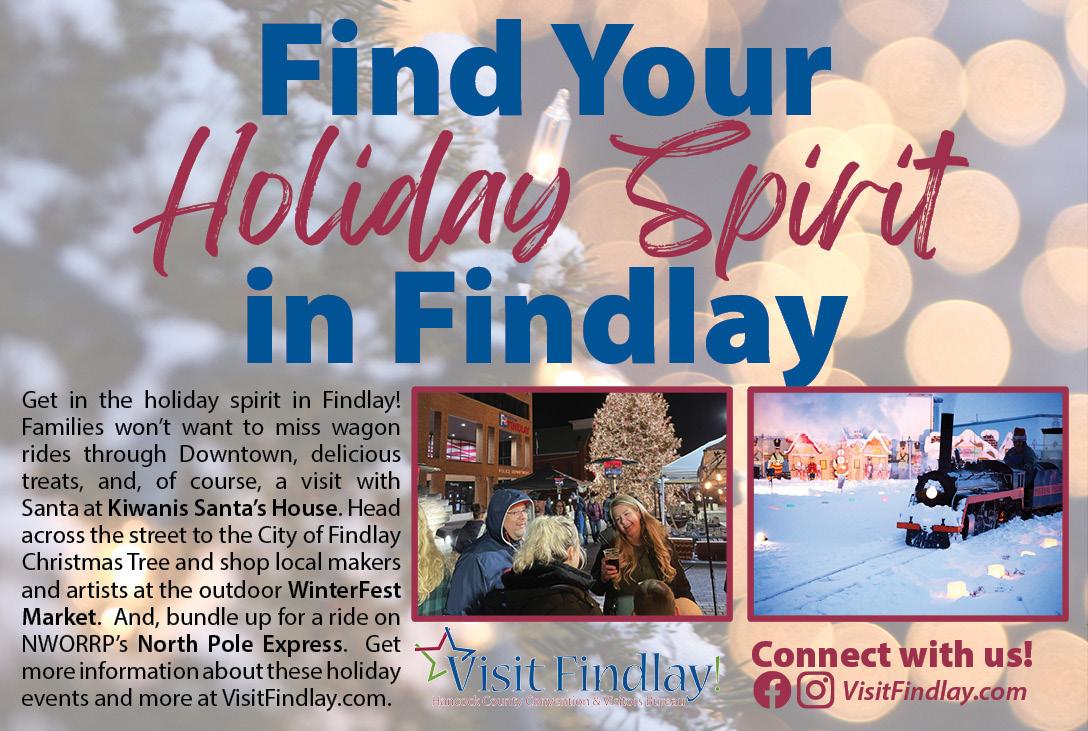 The whole family can celebrate the holidays in Findlay too, with Winterfest every Friday between Thanksgiving and Christmas. Visit Santa’s House, enjoy a local makers market and more. For more information, go to visitfindlay.com