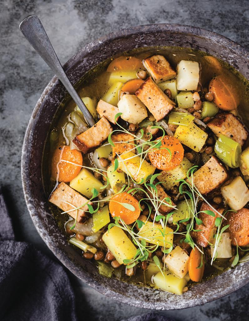 4 Linsen, Tofu und Gemüse vermengen, gut umrühren und Wasser hinzufügen, bis die gewünschte Konsistenz erreicht ist.