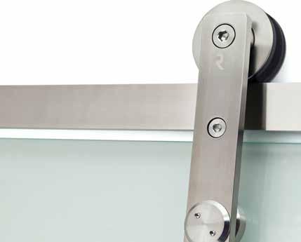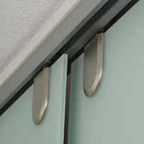 DOOR POSITION Inside frame with surface rail ROLLER TYPE Axel ROLLER POSITION Upper DOOR THICKNESS 5/16" to 1/2" (8 to 12.7 mm) TRACK MOUNTING Ceiling-mounted and recessed DOOR MOUNTING METHOD Drill HARDWARE SET FOR 1 GLASS DOOR RAIL LENGTH PRODUCT Partial set for single glass door 8920492 Bottom guide, satin aluminum finish 8916029100 Bottom guide, stainless steel effect finish 8921267170 Floor-mounted door stop, satin chrome finish 8920773174 Floor-mounted door stop, stainless steel effect finish 8921473170 REQUIRES ONE OF THE FOLLOWING PRODUCTS RAIL LENGTH PRODUCT Pre-drilled top track, satin aluminum finish 98” (2.5 m) 891486610 Pre-drilled top track, satin aluminum finish 118” (3 m) 891486710 Pre-drilled top track, satin aluminum finish 157” (4 m) 891486810 Pre-drilled top track, satin aluminum finish 236” (6 m) 891486910 SUGGESTED PRODUCT PRODUCT Anthracite plastic cover cap for top track 892090590
