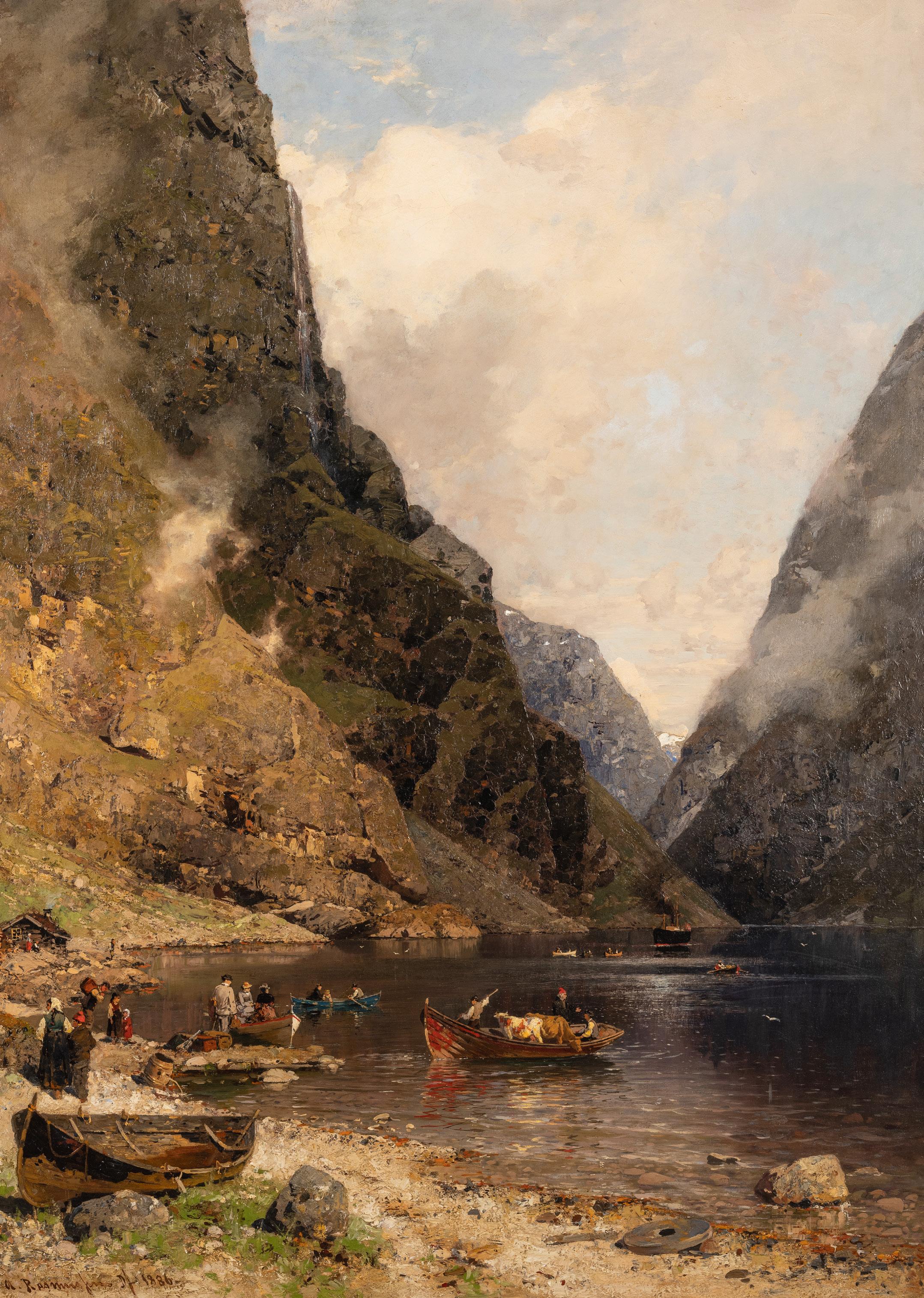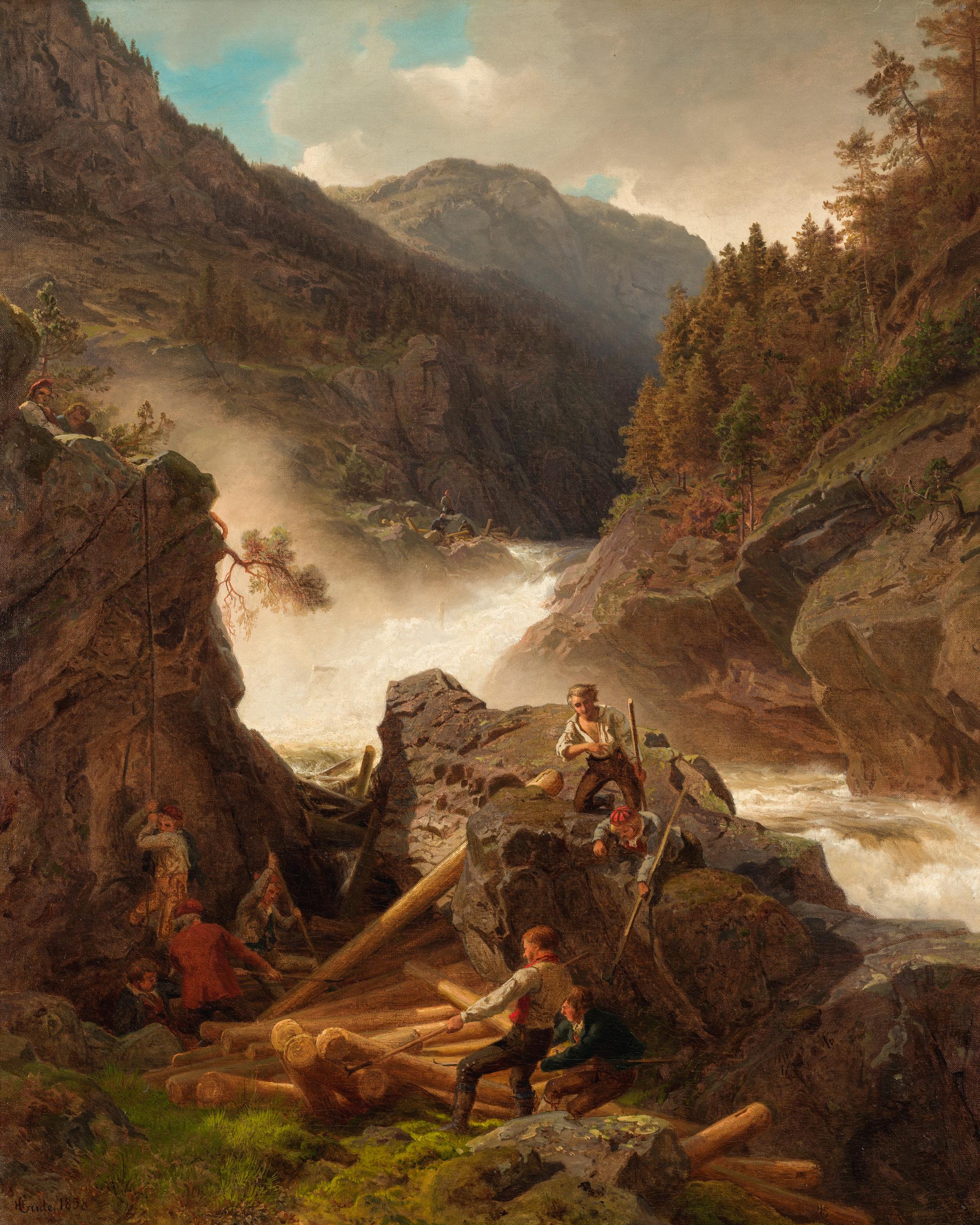 Fra Hjelle i Valdres. Det ferdige mektige, høyromantiske maleriet med norsk motiv fra 1851. Olje på lerret 92,5x135,5 cm. Nasjonalmuseet for kunst, arkitektur og design.