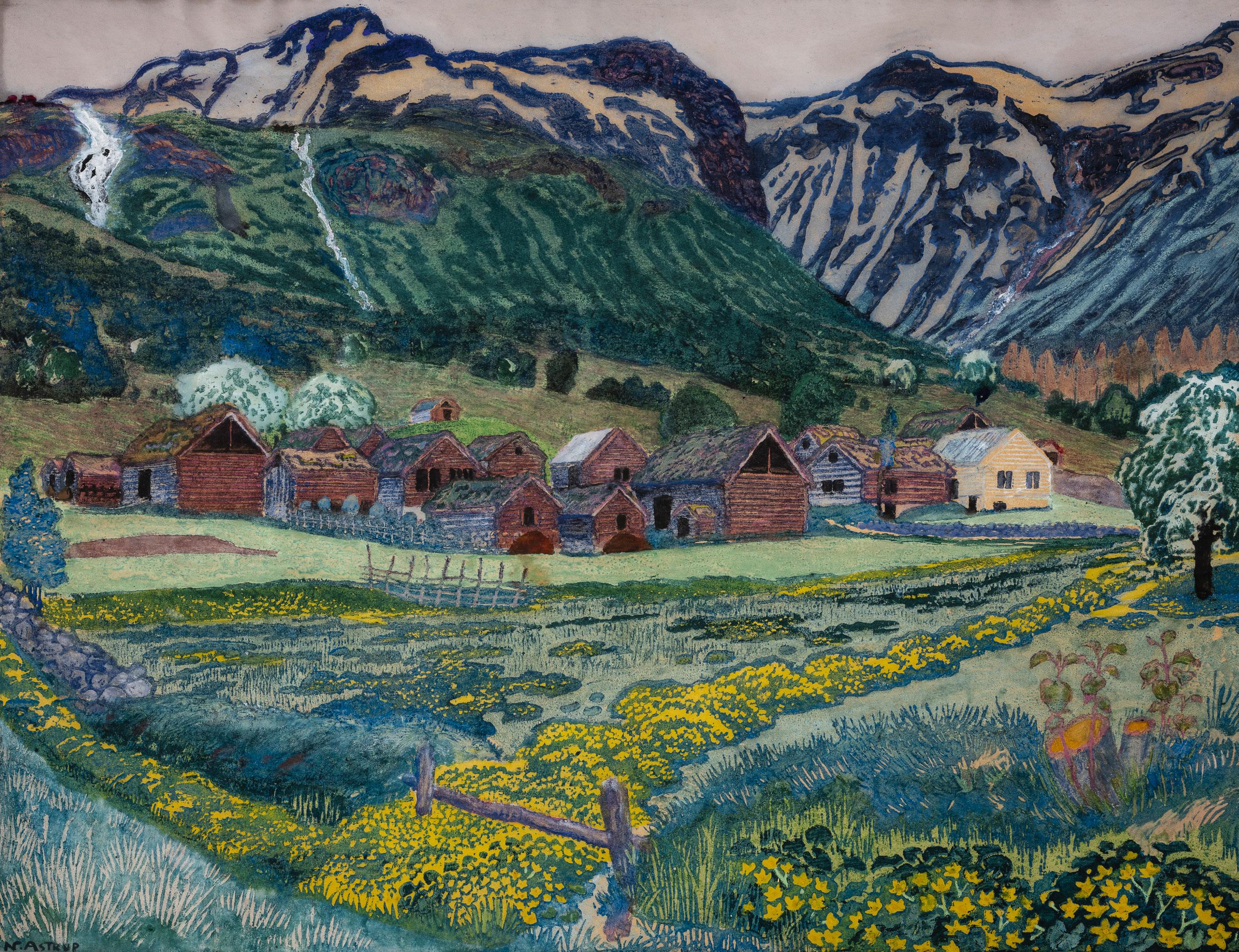 Fra Hjelle i Valdres. Studie fra Norges-reisen i 1850. Olje på papir, oppklebet på lerret 24x37 cm. Nasjonalmuseet for kunst, arkitektur og design.