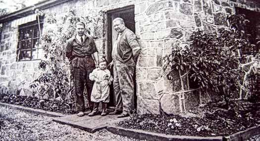 Tre generasjoner Nielsen-Kildeborg foran det litografiske trykkeriet Litografia på Nordstrand. Anton Peder med sønnen Thorleif til venstre og barnebarnet Bjørn i midten.