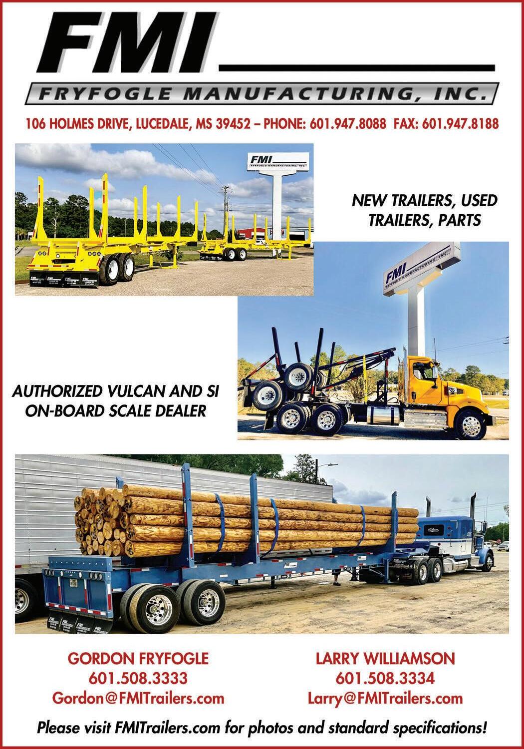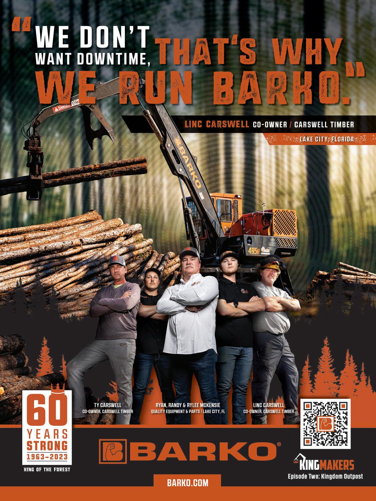 Southern Loggin’ Times (ISSN 0744-2106) is published monthly by Hatton-Brown Publishers, Inc., 225 Hanrick St., Montgomery, AL 36104. Subscription Information—SLT is sent free to logging, pulpwood and chipping contractors and their supervisors; managers and supervisors of corporate-owned harvesting operations; wood suppliers; timber buyers; wood procurement and land management officials; industrial forestry purchasing agents; wholesale and retail forest equipment representatives and forest/logging association personnel in the U.S. South. See form elsewhere in this issue. All non-qualified U.S. subscriptions are $65 annually; $75 in Canada; $120 (Airmail) in all other countries (U.S. funds). Single copies, $5 each; special issues, $20 (U.S. funds). Subscription Inquiries TOLL-FREE 800-669-5613; Fax 888-611-4525. Go to www.southernloggintimes.com and click on the subscribe button to subscribe/renew via the web. All advertisements for Southern Loggin’ Times magazine are accepted and published by Hatton-Brown Publishers, Inc. with the understanding that the advertiser and/or advertising agency are authorized to publish the entire contents and subject matter thereof. The advertiser and/or advertising agency will defend, indemnify and hold Hatton-Brown Publishers, Inc. harmless from and against any loss, expenses, or other liability resulting from any claims or lawsuits for libel violations or right of privacy or publicity, plagiarism, copyright or trademark infringement and any other claims or lawsuits that may arise out of publication of such advertisement. Hatton-Brown Publishers, Inc. neither endorses nor makes any representation or guarantee as to the quality of goods and services advertised in Southern Loggin’ Times. Hatton-Brown Publishers, Inc. reserves the right to reject any advertisement which it deems inappropriate. Copyright ® 2023. All rights reserved. Reproduction in whole or in part without written permission is prohibited. Periodicals postage paid at Montgomery, Ala. and at additional mailing offices. Printed In USA.