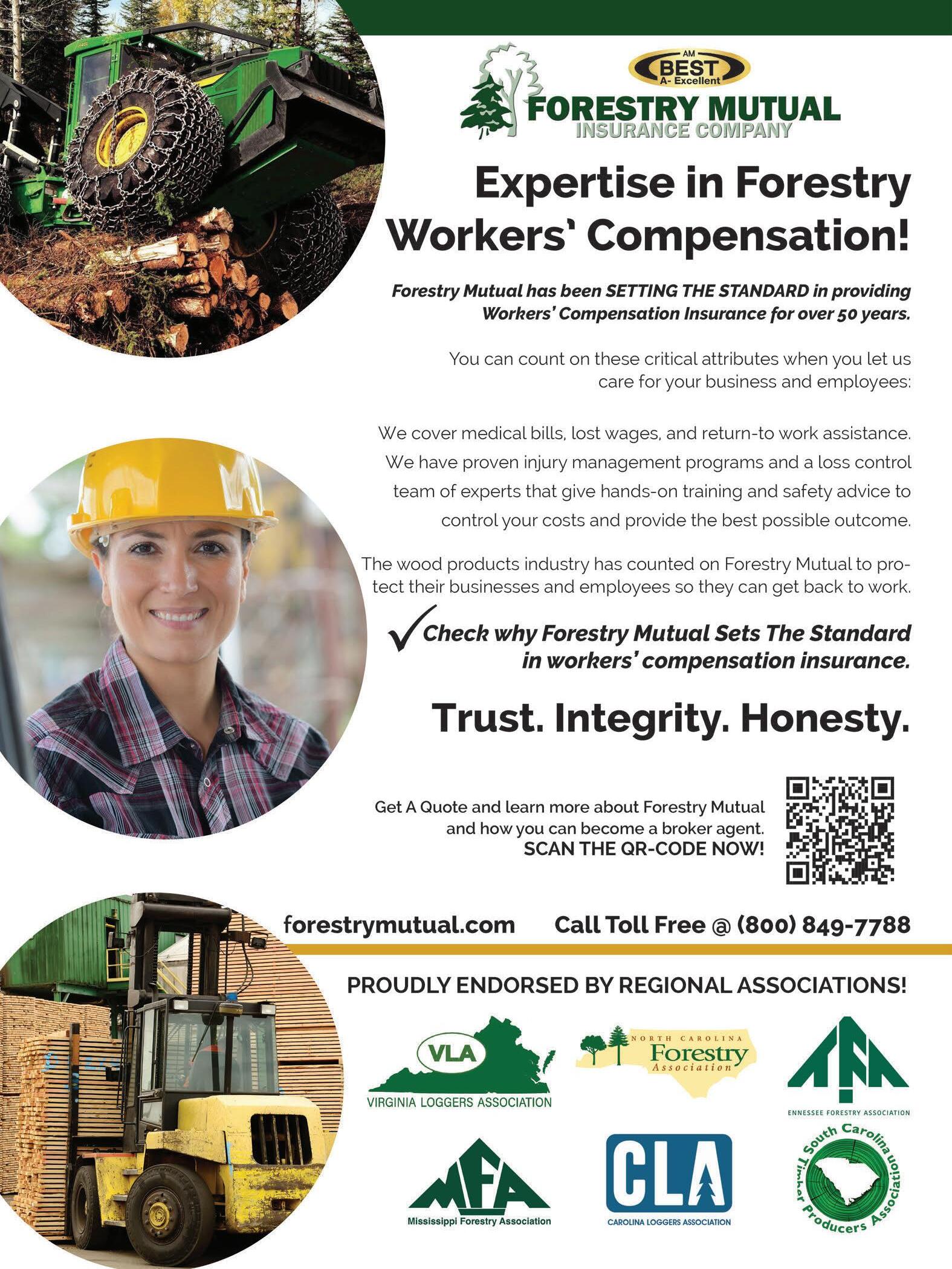 Southern Loggin’ Times (ISSN 0744-2106) is published monthly by Hatton-Brown Publishers, Inc., 225 Hanrick St., Montgomery, AL 36104. Subscription Information—SLT is sent free to logging, pulpwood and chipping contractors and their supervisors; managers and supervisors of corporate-owned harvesting operations; wood suppliers; timber buyers; wood procurement and land management officials; industrial forestry purchasing agents; wholesale and retail forest equipment representatives and forest/logging association personnel in the U.S. South. See form elsewhere in this issue. All non-qualified U.S. subscriptions are $65 annually; $75 in Canada; $120 (Airmail) in all other countries (U.S. funds). Single copies, $5 each; special issues, $20 (U.S. funds). Subscription Inquiries TOLL-FREE 800-669-5613; Fax 888-611-4525. Go to www.southernloggintimes.com and click on the subscribe button to subscribe/renew via the web. All advertisements for Southern Loggin’ Times magazine are accepted and published by Hatton-Brown Publishers, Inc. with the understanding that the advertiser and/or advertising agency are authorized to publish the entire contents and subject matter thereof. The advertiser and/or advertising agency will defend, indemnify and hold Hatton-Brown Publishers, Inc. harmless from and against any loss, expenses, or other liability resulting from any claims or lawsuits for libel violations or right of privacy or publicity, plagiarism, copyright or trademark infringement and any other claims or lawsuits that may arise out of publication of such advertisement. Hatton-Brown Publishers, Inc. neither endorses nor makes any representation or guarantee as to the quality of goods and services advertised in Southern Loggin’ Times. Hatton-Brown Publishers, Inc. reserves the right to reject any advertisement which it deems inappropriate. Copyright ® 2023. All rights reserved. Reproduction in whole or in part without written