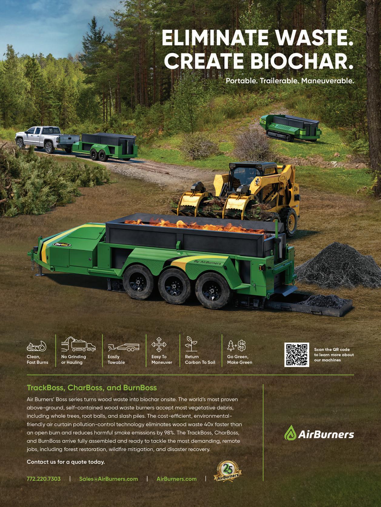 After a successful debut at the University of Idaho Experimental Forest in January 2023 and a biochar production demonstration in Harrisonburg, Va., the world’s first mobile onsite biochar production system is ready tackle even the most challenging, most demanding jobs with no grinding, hauling, or permanent facilities. Visit airburners.com.