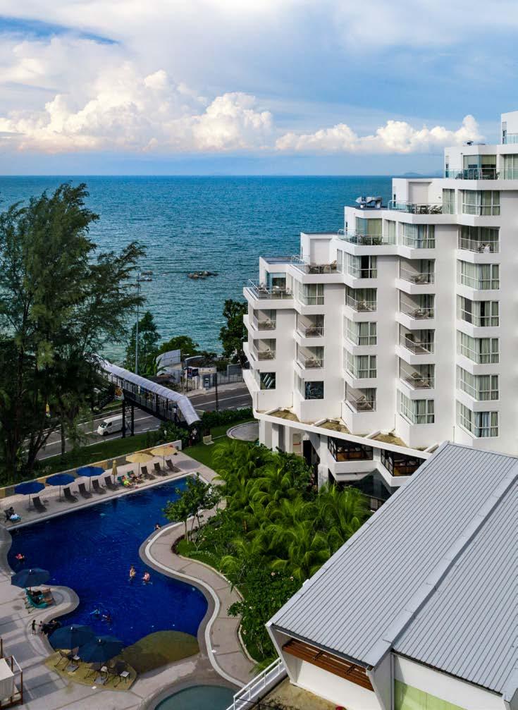 The resort’s prime location adjacent to Miami Beach, accessible via an overhead bridge, offers stunning views of the Malacca Strait. Georgetown is a 20-minute drive away, and Penang International Airport is 45 minutes by car.