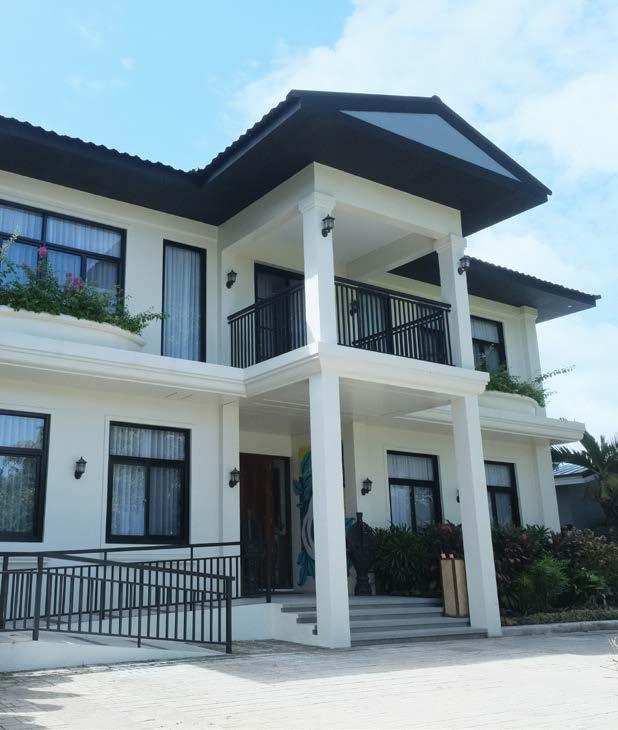 The resort’s exterior features a modern design with louvers on the deep green walls,