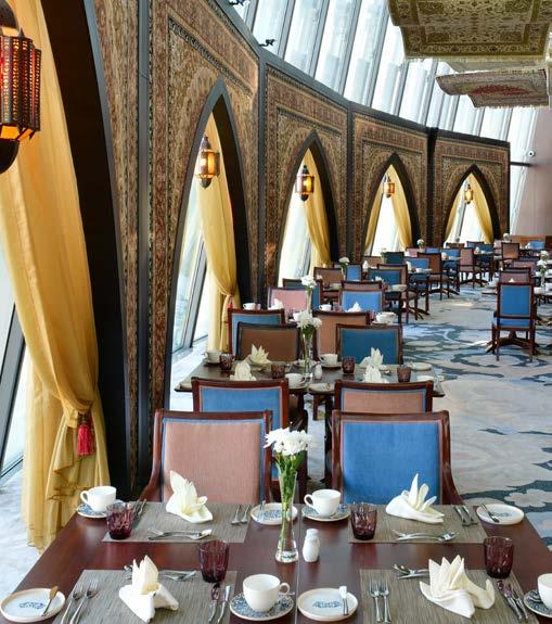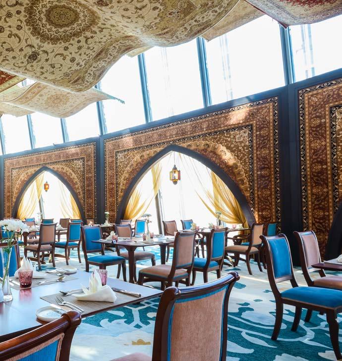 Dining at the restaurant is a true Arabian fairytale experience, especially when the restaurant comes to life with special lights and the plethora of actual Arabic carpets above the dining tables.