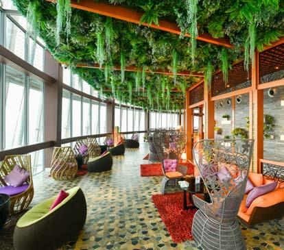 The fully airconditioned interior is surrounded by a full glass ceiling, walls, and greenery accented with grand chandeliers. Glass house allows majestic views of lush gardens of Aspire Park.