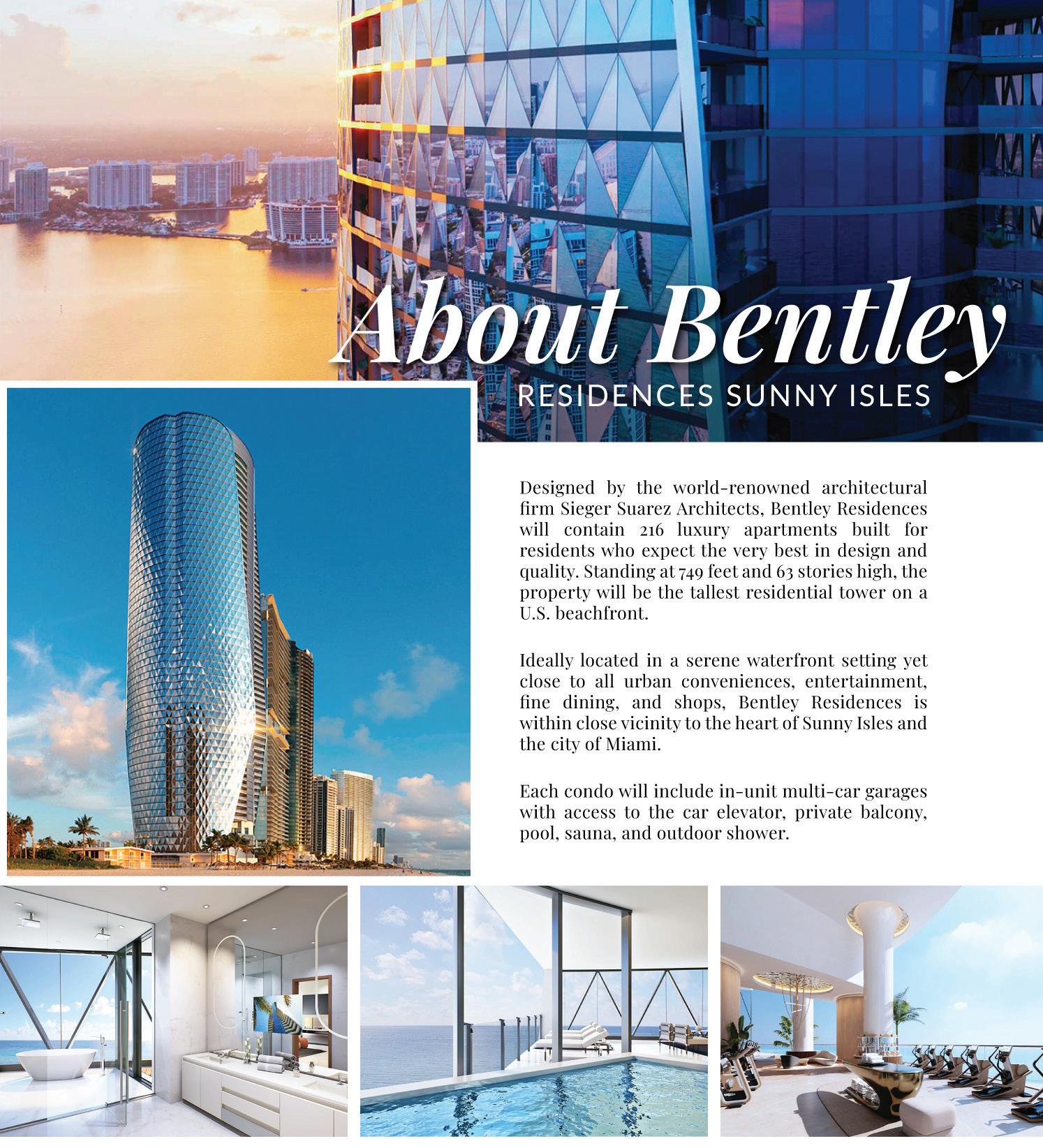 Designed by the world-renowned architectural firm Sieger Suarez Architects, Bentley Residences will contain 216 luxury apartments built for residents who expect the very best in design and quality. Standing at 749 feet and 63 stories high, the property will be the tallest residential tower on a U.S. beachfront.
