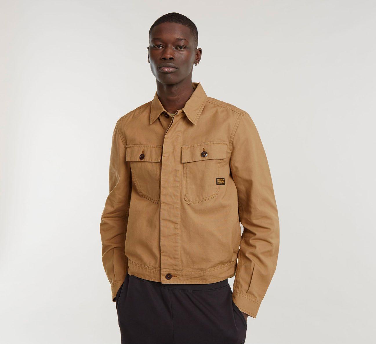With a concealed button closure, and pleated waistband, this jacket combines casual, yet masculine flap pockets on the side seams and chest with a sophisticated collar and cuff finish.