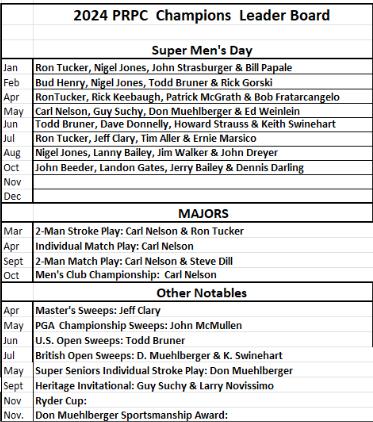 2024 is shaping up to be an MVP year for Carl Nelson Carl has won both our Individual Match-Play & Stroke-play Majors as well as partnering (with Ron Tucker & Steve Dill) to win both 2-man Major Tournaments this year Carl has now notched his 3rd PRPC Club Championship by putting a “Full Nelson” on the field! (- highlighted in red is an addition)