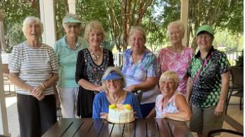 From the left, Mary Zych, Hiltrud Gabler, Sophie Burger, Cheryl Moore, Heather Stevens, and Carol Duffin Sitting beside birthday girl