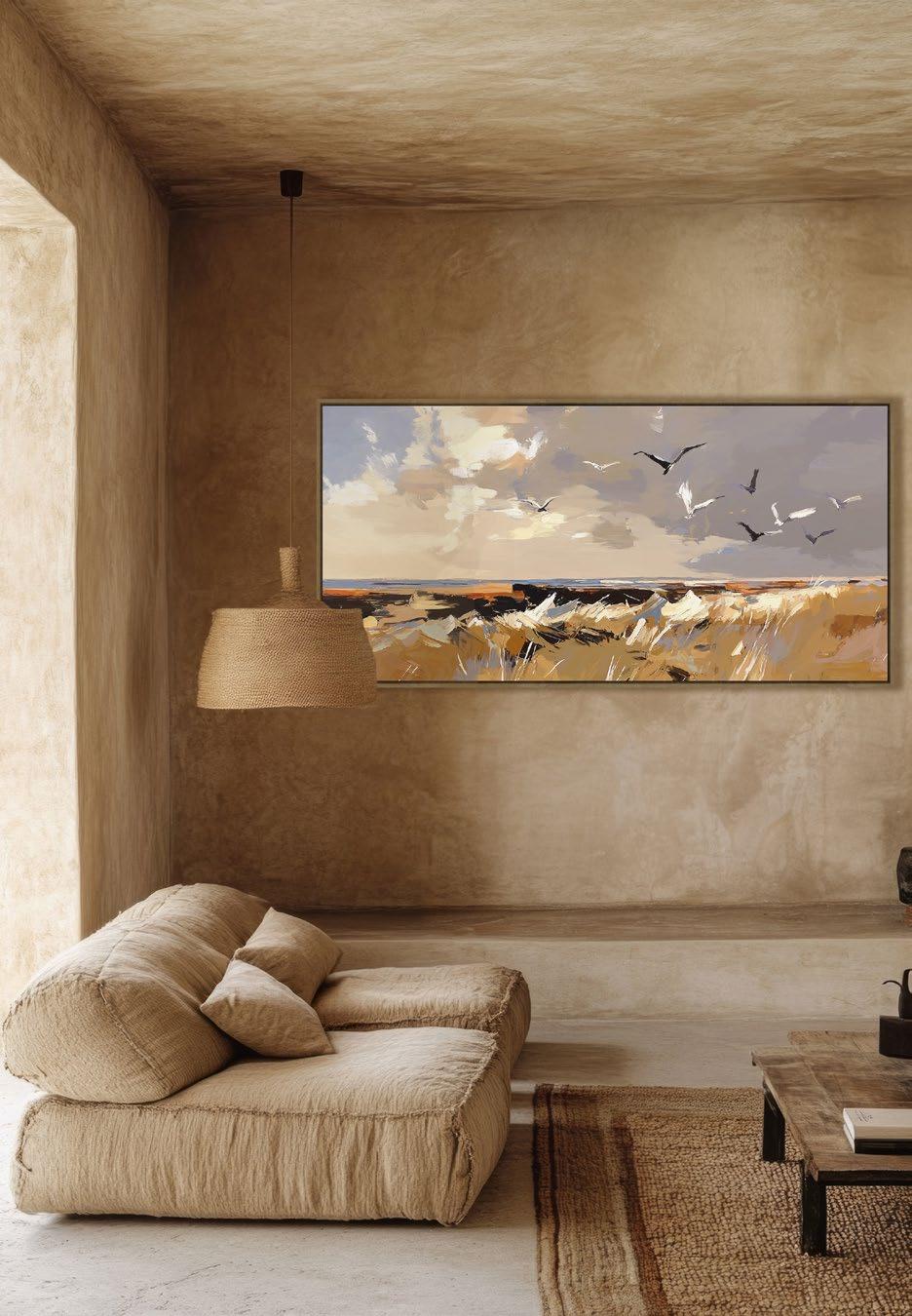 Rural and seaside landscapes evoke a sense of expansiveness and tranquillity. These artworks guide the gaze with striking perspectives, while dynamic brushwork and rich textures add depth and vibrancy to each scene.