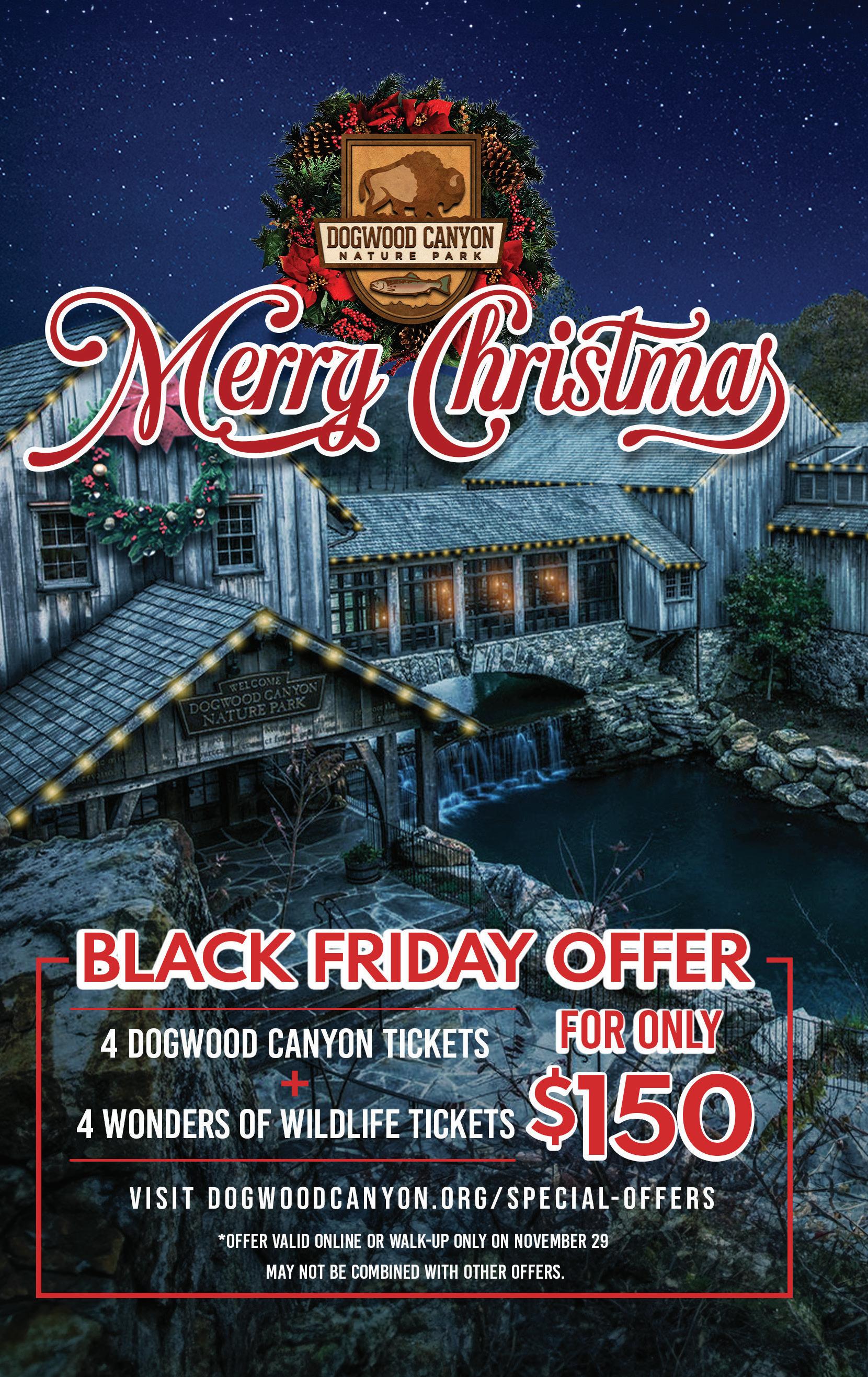 Dogwood Canyon Nature Park in Lampe, MO, spans more than 10,000 acres, offering hiking and biking trails, wildlife tours, horseback riding, and trout fishing, all set against a stunning landscape of towering bluffs, waterfalls, creeks, and abundant wildlife. Support conservation efforts by gifting an annual membership, which includes unlimited visits to the park, special discounts, and exclusive benefits for members. The Black Friday Offer includes four tickets to Dogwood Canyon and four tickets to Wonders of Wildlife for only $150. This offer is valid online or for in-person purchase on Nov. 29. See the ad on page 17.