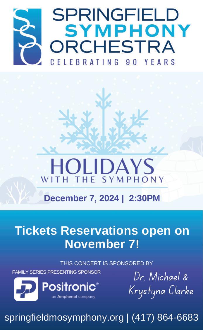 Springfield Symphony Orchestra free holiday concert ticket reservations open today. The concert is Saturday, Dec. 7, 2:30 p.m. at Hammons Hall. springfieldmosymphony.org/familyseries See the ad on page 20.