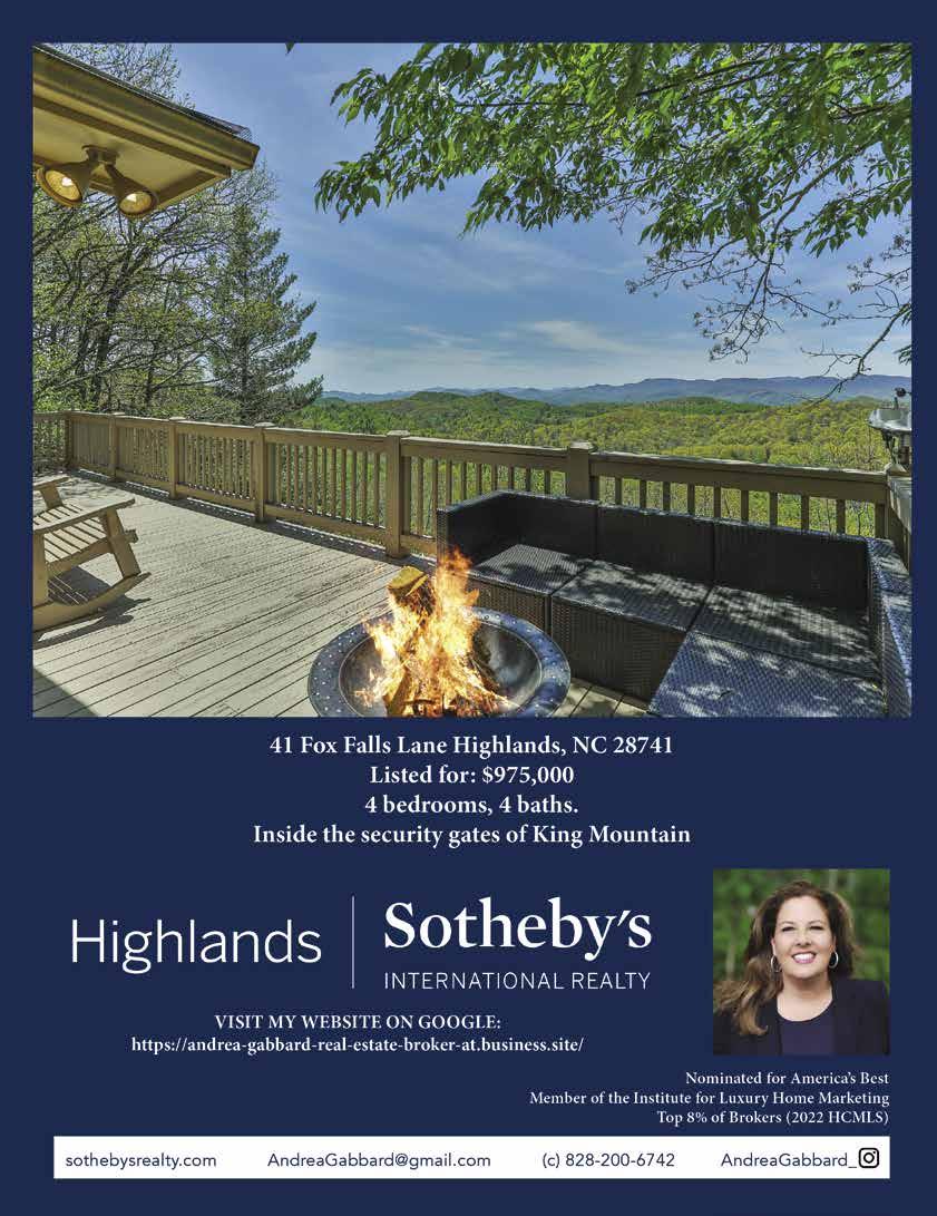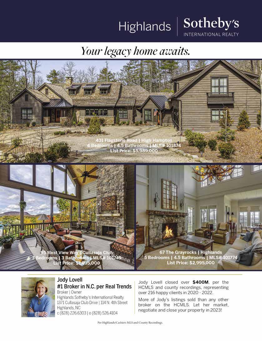 256 JUNE 2023 | THELAURELMAGAZINE.COM ADVERTISER’S INDEX The Consignment Market P 29 Country Club Properties ccphighlandsnc.com P 2 Crawford Construction P 12 Creative Concepts P 220 Cynthia Strain, Photographer/Author P 46 The Dancing Bear at the High Dive P 150 Dauntless Printing P 172 Dawson County destinationdawsonville.com P 138 Diane McPhail, Artist P 136 Don Leon’s P 35 The Dry Sink thedrysink.com P 37 Dutchmans dutchmansdesigns.com P 36 Edgewood Antiques & Fine Furnishings P 64 Elena’s Women’s Golf and Activewear elenagolf.com P 62 Elevation of Highlands P 208 Ellie’s Groove P 52 Fern of Highlands P 179 Fire + Water firemt.com P 15 Fire Mountain Inn & Cabins firemt.com P 15 Four65 Woodfire Bistro + Bar four65.com P 151 Four Seasons Landscape fsl-wnc.com P 68 Fressers Eatery wecaterhighlands.com P 145 Fusion Yoga & Wellness fusionyogaandwellness.com P 61 Gracewear gracewearcollection.com P 166 Grand Olde Station grandoldestation.com P 185 The Greystone Inn thegreystoneinn.com P 4, 191 Headwaters Outfitters headwatersoutfittters.com P 188 Hidden Valley Tavern hiddenvalleytavern.com P 27 High Camp HighCampNC.com P 4 The High Dive P 150 Highland Hiker highlandhiker.com P 59 Highlands Aerial Park highlandsaerialpark.com P 84 Highlands Cashiers Chamber Music Festival h-cmusicfestival.org P 56, 114, 128, 137 Highlands Cashiers Health Foundation hchealthfnd.org P 211 Highlands-Cashiers Players highlandsperformingart.com/hcp P 226 Highlands Chamber of Commerce highlandschamber.org P 105 Highlands Dermatology highlandsdermatology.com P 61, 209 Highlands Fine Art & Estate Jewelry Wine Shop highlandsfineart.com P 22, 23 Highlands Lawn & Garden highlandslawnandgarden.com P 111 Highlands Outpost highlandsoutpost.com P 84 Highlands Performing Arts Center highlandsperformingarts.com P 127, 199, 222 Highlands Pharmacy P 214 Highlands Pizza Place P 145 Highlands Porchfest highlandsporchfest.com P 139 Highlands Rock Yard highlandsrockyard.com P 102 Highlands Smokehouse highlandssmokehouse.com P 157 Highlands Sotheby’s International Realty - Andrea Gabbard sothebysrealty.com P 165 Highlands Sotheby’s International Realty - Sheryl Wilson highlandssir.com P 221 Highlands Transportation Company P 103 Historic Toxaway Market historictoxawaymarket.com P 191 HomeChoice Windows & Doors P 51 Hudson Library fontanalib.org P 214 4118 Kitchen and Bar 4118kitchen-bar.com P 154 A Jones Company P 59 A-List Antiques P 178 Acorns P 260 ACP Home Interiors acphomeinteriors.com P 69 Aery Chiropractic aerychiropractic.com P 209 Allen Tate/ Pat Allen Realty Group patallenrealtygroup.com P 9, 113 Allison Diane P 50 Ann Lea Fine Art Gallery P 120 Annawear annawearnc.com P 226 Appalachian Construction app-construction.com P 190 Around Back at Rocky’s Place aroundbackatrockysplace.com P 137 Art Highlands Gallery arthighlands.com P 129 Atelier Maison ateliermaisonco.com P 71 Balistreri Realty laketoxawayliving.com P 187 The Bascom thebascom.org P 119 Barbara Jamison Paintings barbarajamisonpaintings.com P 136 Bazaar Barn P 57 Bear Tracks Travel Center beartrackstravelcenter.com P 190 Bella Cotn bellacotn.com P 41 Bella’s Junction Cafe P 152 Berkshire Hathaway HomeServices meadowsmountainrealty.com P 200 Betsy Paul Art Benefit P 89 Betsy Paul Properties betsypaulproperties.com P 259 Bijou Jewelry bijoujeweler.com P 49 Bird Barn & Garden P 231 Black Rock Design Build blackrockdb.com P 177, 220 The Blue Elephant P 102 Blue Ridge Bedding blueridgebedding.com P 164 Blue Ridge Music blueridgemusicacademy.com P 204 Bombshell Hair Boutique P 65 Bounds Cave’s Rug Gallery boundscaverugs.com P 31 Brevard Music Center brevardmusic.org P 40 The Brier Patch P 95 Brookings brookingsonline.com P 97 Bungalow Boutique bungalow828.com P 63 C Orrico corrico.com P 94 Calders Coffee Cafe calderscoffeecafe.com P 155 Caliber Fine Properties caliberfineproperties.com P 76, 77 Carolina Rustic Furniture carolinarusticfurniture.com P 164 Cashiers Benefit Antique Show cashiersbenefitantiqueshow.com P 63 Cashiers Chamber of Commerce cashiersareachamber.com P 204 Cashiers Candy Shoppe P 60 Cashiers Kitchen Company P 231 Cashiers Live cashierslive.com P 207 The Cashiers Store thecashierstore.com P 58 Cashiers Valley Community Chorus P 88 Cashiers Valley Real Estate cashiersvalley.com P 10 Cashiers Valley Smokehouse cashiersvalleysmokehouse.com P 144 Center for Life Enrichment clehighlands.com P 98 Chambers Realty & Vacation Rentals highlandsiscalling.com P 95, 220 Charles Johnson Fine Art Photography charlesjohnsonfineart.com P 131 Chocolate Heaven/Cake Bar P 112 Christine’s Home Decor christineshomedecor.com P 221 Christmas Tree P 28 Classic Lighting & Design, Inc. classiclightinganddesign.com P 94 ADVERTISER’S INDEX