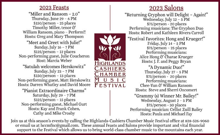 The bagpipe performances, Friday Night Live and Saturdays on Pine Outdoor Concert Series are organized and hosted by the Highlands Chamber of Commerce/Visit Highlands, NC. For more information about these or other events, go to visithighlandsnc.com, call (828) 526-2112 or send an email to events@highlandschamber.org.