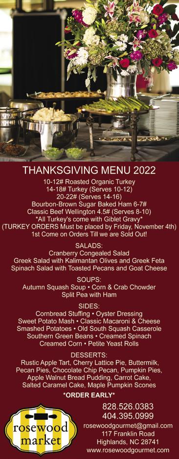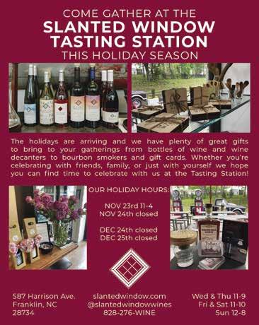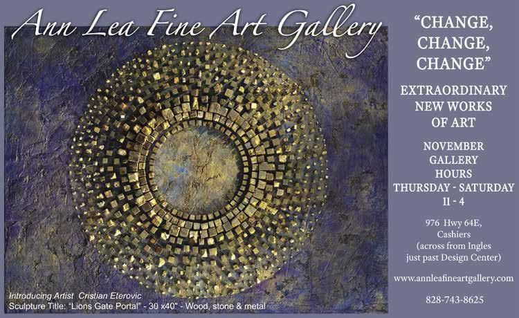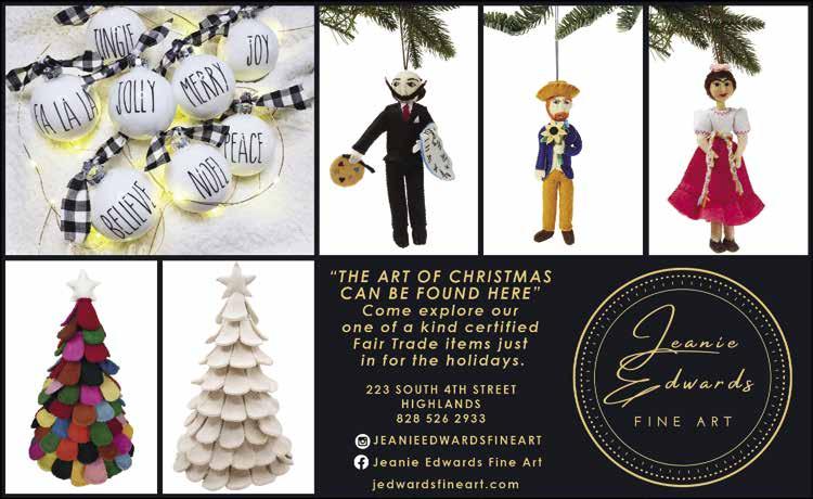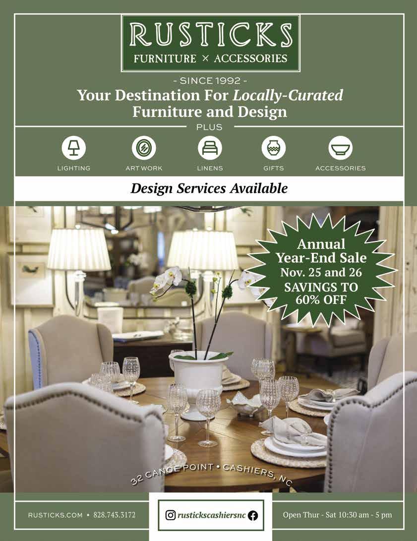 November 2022 L aURe L The Heart of the Highlands-Cashiers Plateau for 20 Years Cover Artist, Carol Misner All Three and Then Some Rusticks Annual Year-End Sale Nov. 25 and 26 pg. 114
