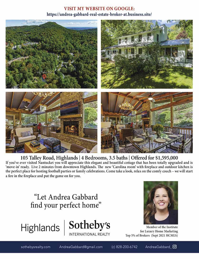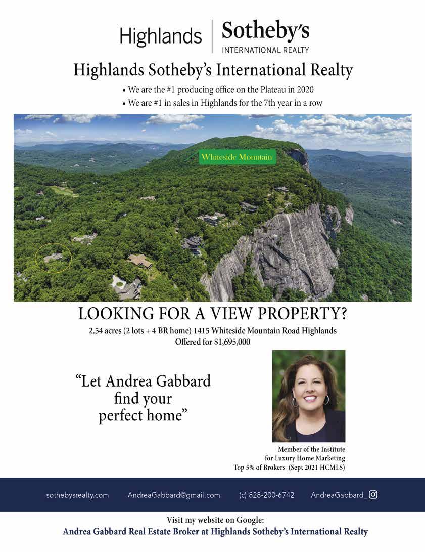 Highlands Sotheby’s International Realty - Andrea Gabbard sothebysrealty.com P 112, 113 Highlands Sotheby’s International Realty - Tommy Jenkins sothebysrealty.com P 169