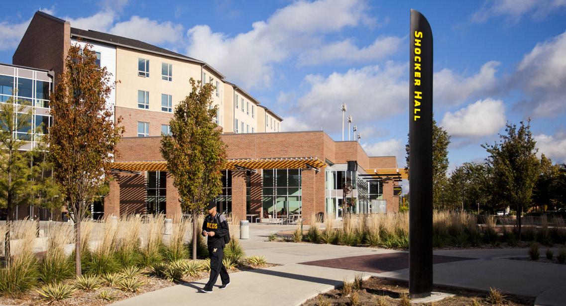 The campus wayfinding at Wichita State University features elegant forms that echo the movement of wheat stalks gently blowing in the wind. The wheat grain pattern is water-jet cut, allowing the yellow accent color of the grains to show through and glow at night, like beacons. The system includes building identification markers, vehicular directional signs, pedestrian directional signs, map artwork and pedestrian kiosks.