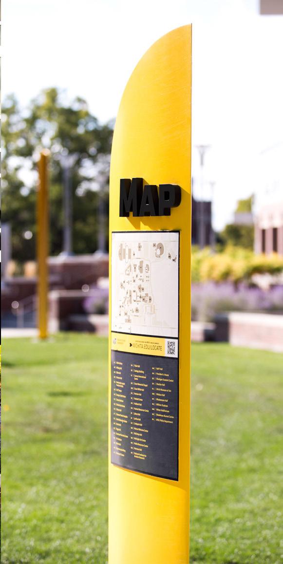 The campus wayfinding at Wichita State University features elegant forms that echo the movement of wheat stalks gently blowing in the wind. The wheat grain pattern is water-jet cut, allowing the yellow accent color of the grains to show through and glow at night, like beacons. The system includes building identification markers, vehicular directional signs, pedestrian directional signs, map artwork and pedestrian kiosks.