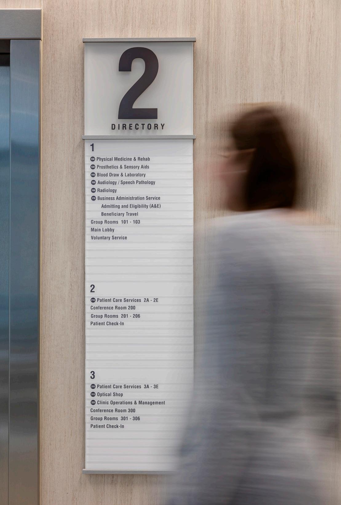 To create a strong sense of arrival, the entry features a memorial plaza and art wall that celebrates Veterans and their service. The wayfinding is simple and provides clear direction using logic that follows the orientation of the building, proximity to the elevators and vertical circulation. The backlit signage panels create an elegant twist on the VA signage standards that also compliments the interiors.