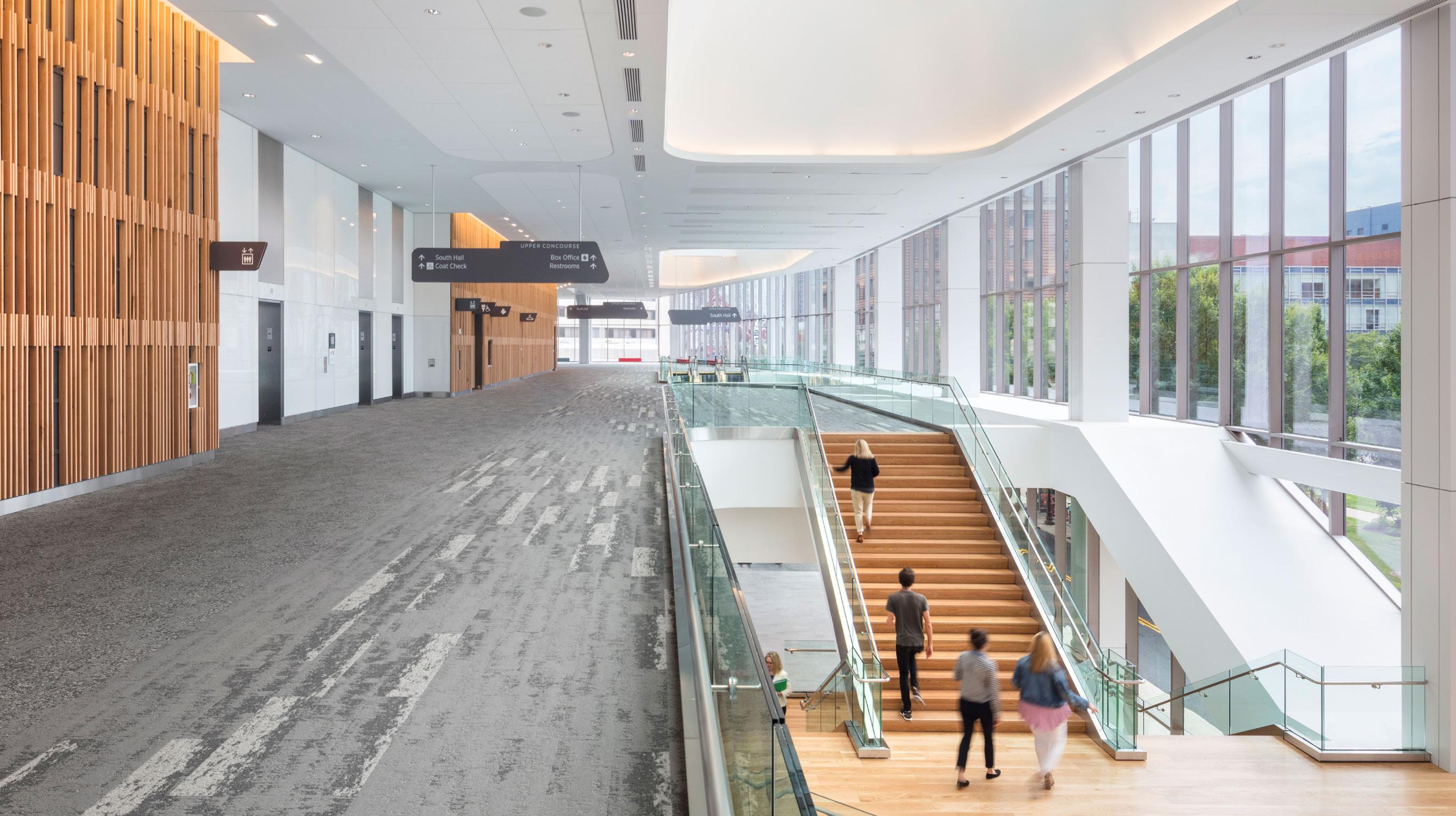A newly-expanded convention center puts downtown Louisville on display and creates an inviting front porch for the passerby. Convention centers are often difficult to navigate because of their large size and out-of-town guests. The improved wayfinding simplifies circulation paths and connects visitors visually to their surroundings. The sign designs are purposefully organic and relate to the architectural design and form of the skylights.