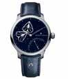 Logé dans un boîtier en or rouge de 43 mm, le cadran paillonné sur émail Grand Feu bleu et opalin argenté avec applique en or rouge abrite un mouvement automatique. Cette pièce existe en 8 exemplaires. Nestling inside a 43mm red gold case, the paillonnédial with a blue and opaline silver Grand Feu enamel base and red gold applique conceals a self-winding movement. This model is issued in an eightpiece edition.