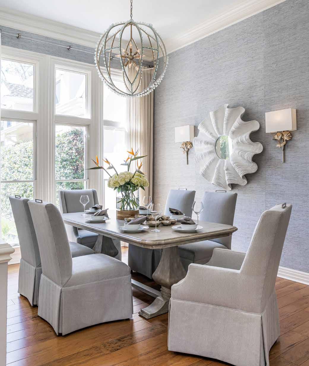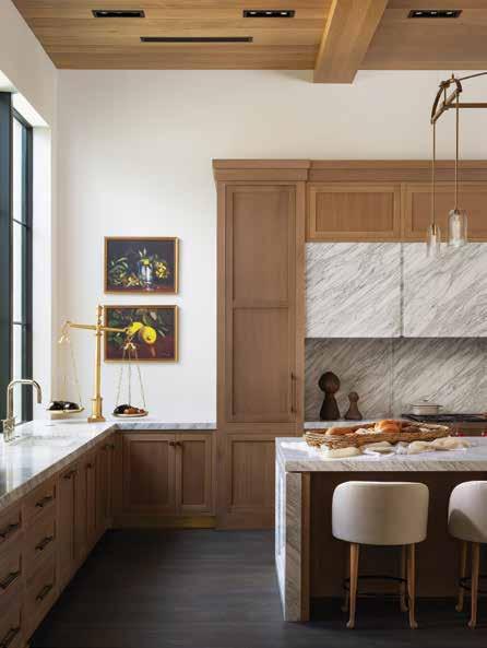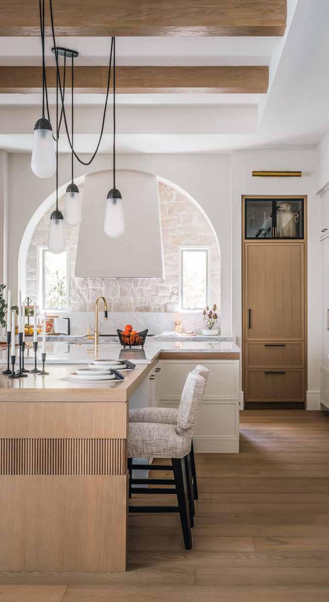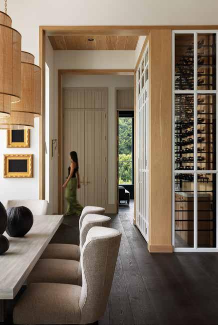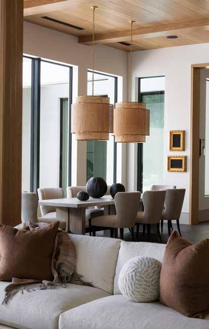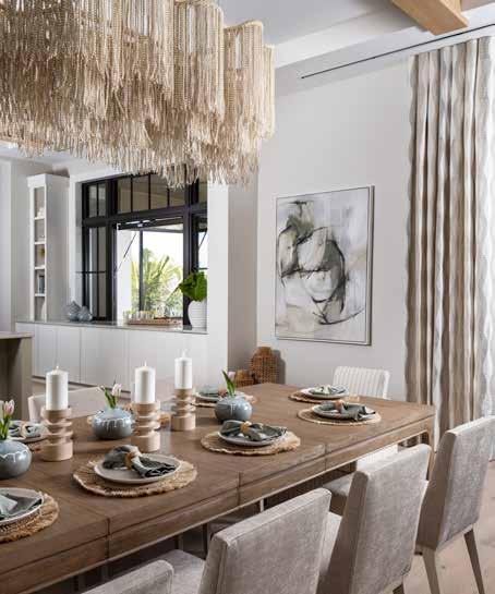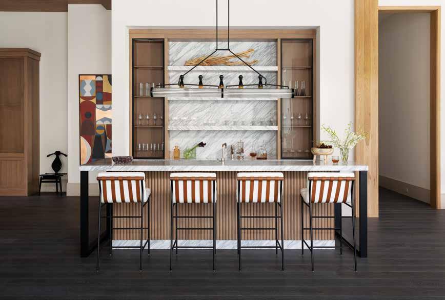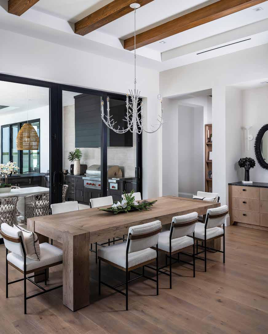 Dining Room: “Minka truly captured the blend of coastal contemporary and hunting lodge,” says Lykos. “We have a white ceiling with substantial wood beams instead of all wood, striking a balance that represents both styles very well.” Above the robust table from Four Hands is a twiginspired chandelier from Currey & Company — blending these styles with refinement. A built-in serving station, topped with Black Vermont quartzite in a river-washed finish from UMI Stone, repeats that material from the outdoor kitchen.