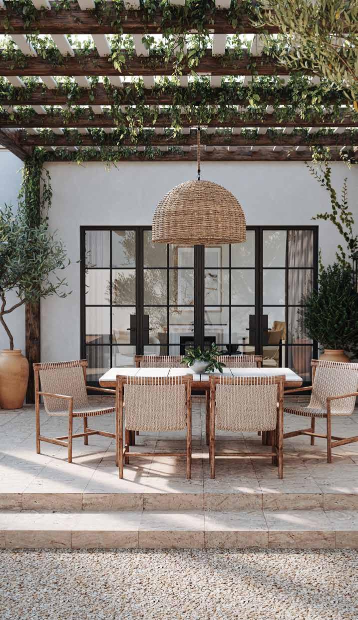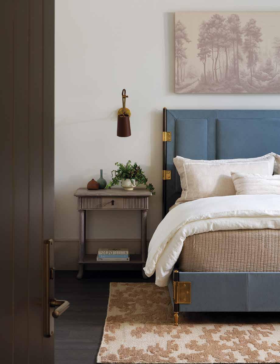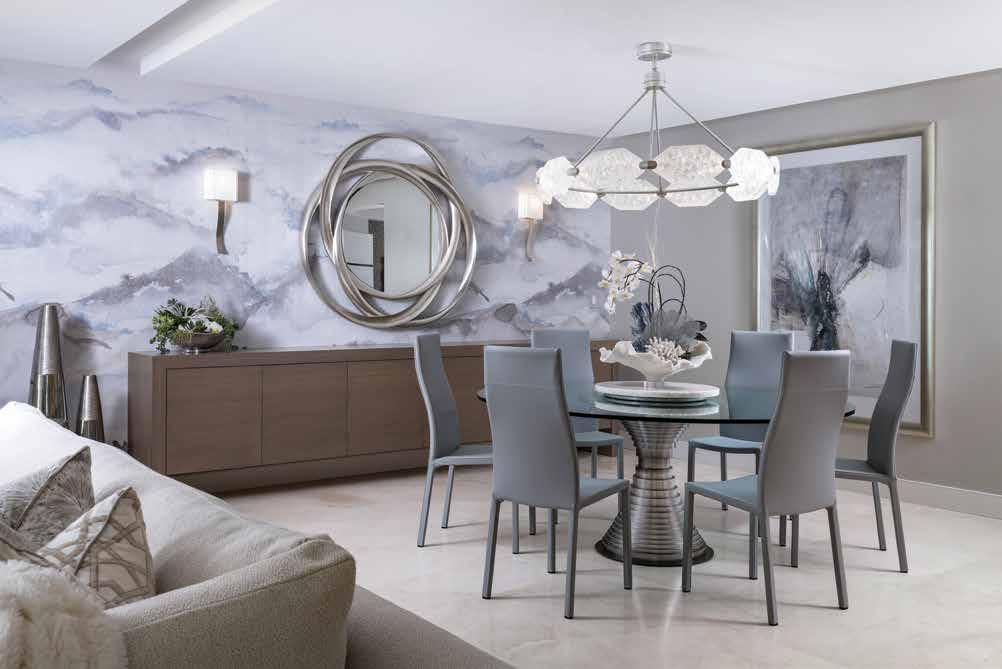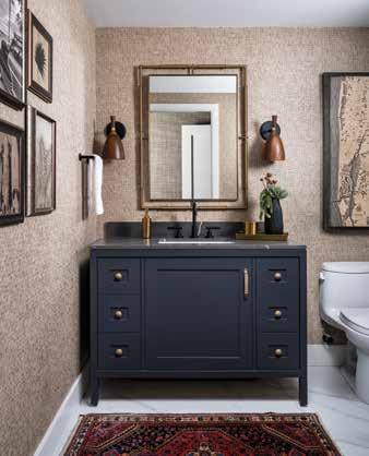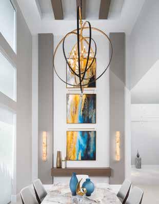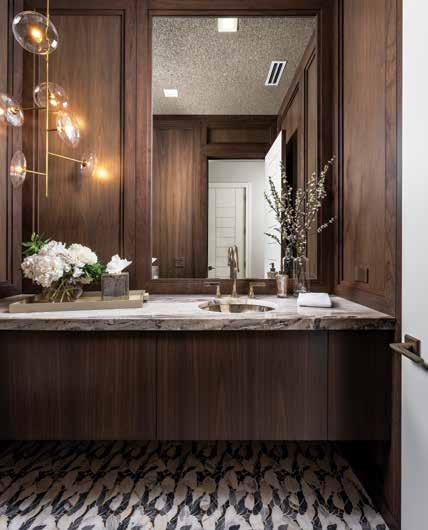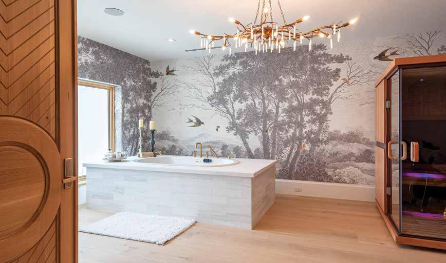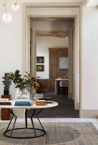 Dining Room: “Minka truly captured the blend of coastal contemporary and hunting lodge,” says Lykos. “We have a white ceiling with substantial wood beams instead of all wood, striking a balance that represents both styles very well.” Above the robust table from Four Hands is a twiginspired chandelier from Currey & Company — blending these styles with refinement. A built-in serving station, topped with Black Vermont quartzite in a river-washed finish from UMI Stone, repeats that material from the outdoor kitchen.